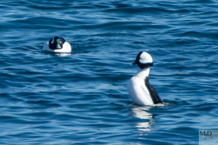Buffleheads perform mating displays just before they head north to their summer breeding grounds. There’s a lot of ritual action that is fun to watch and I tried to capture some of the key elements. One thing they do is a head bob, dropping the head low to the water and then stretching their neck upwards while puffing the feathers. Both sexes do it, as you can see in the bottom photo. The female is the duck with the small white patch on her cheek.