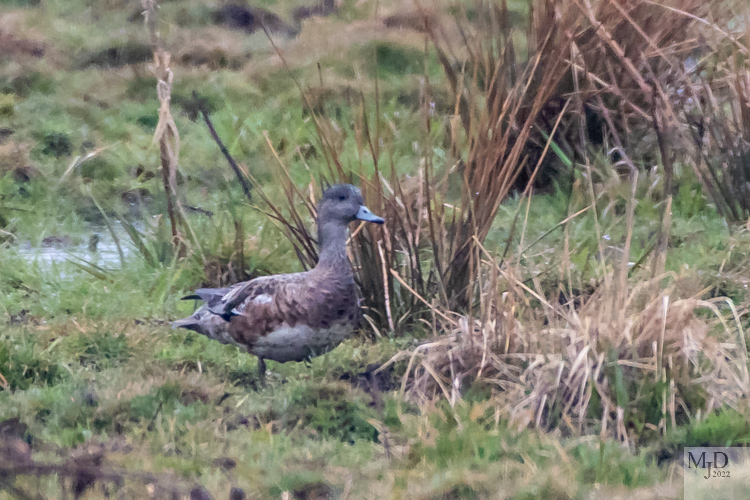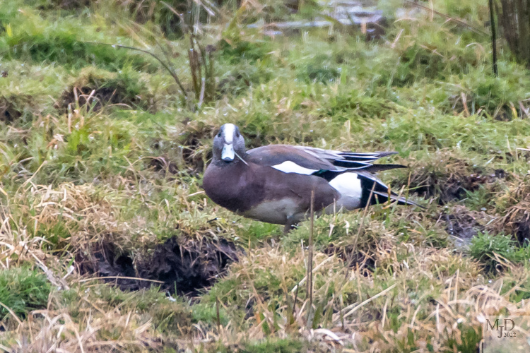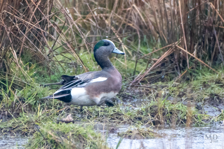 A pair of American Wigeons left the little pond and browsed the grassy area for some tender plants. This is the male.