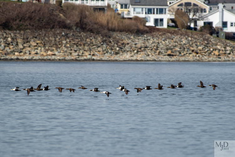 Everyone is watching for the spring arrivals and the migrants who stop to rest before continuing their trips. We are also getting our last looks at the wintering ducks that are disappearing as they migrate north to breed. These pictures are from Plum Island Sound on the southern end of the island. All the birds seemed to be in motion that day, going in and out of the sound. This is part of a large flock of Common Eider flying by the Great Neck area of Ipswich Massachusetts.