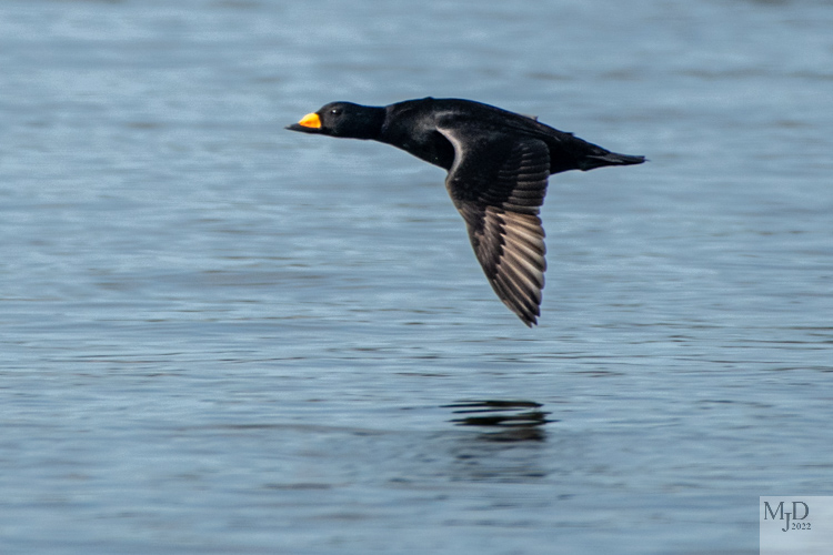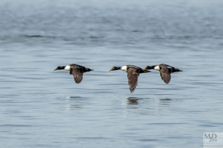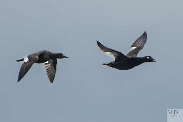 These next two photos are a Black Scoter heading out of the Sound and two White-winged Scoters going in.