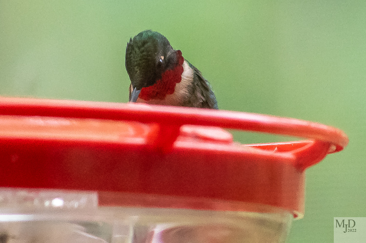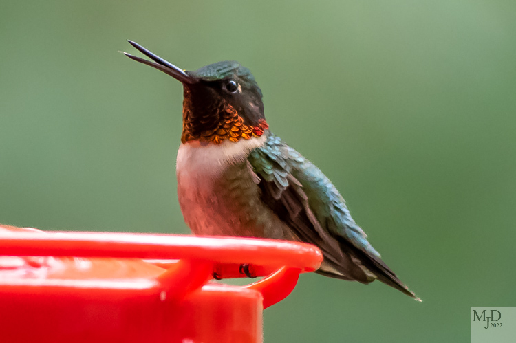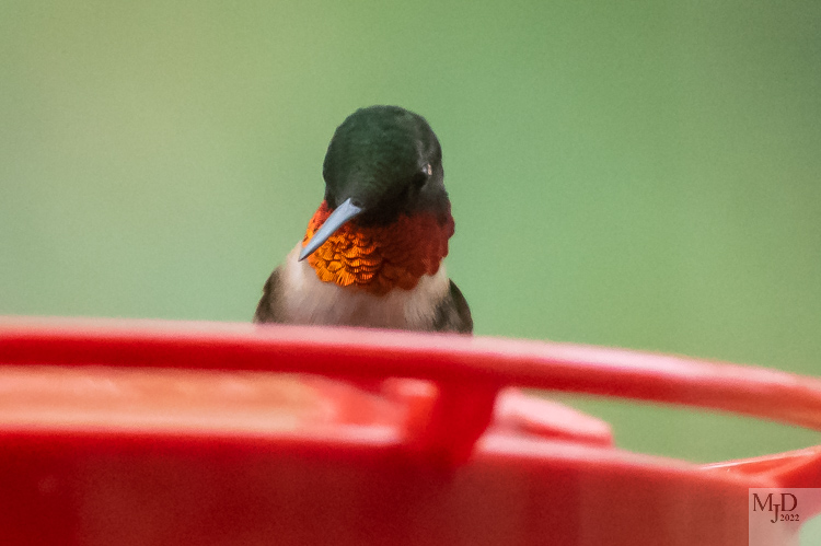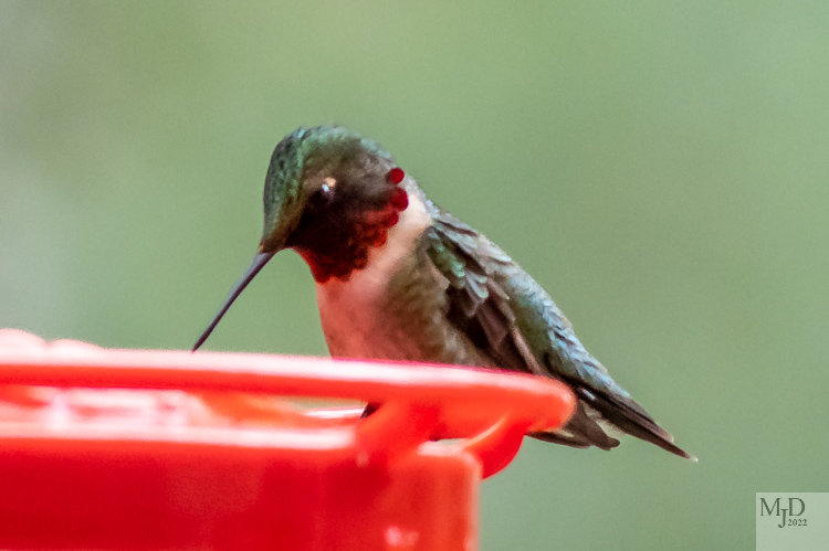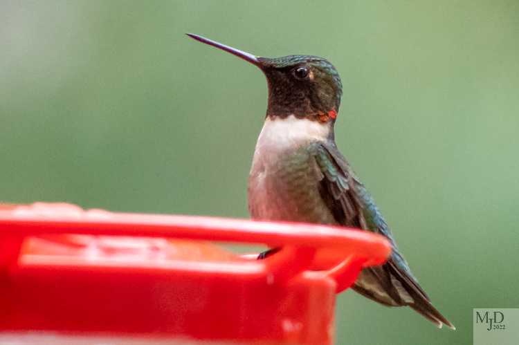 Migration is well under way and the sightings are coming fast and furious. I will post all the action, starting with the return of Ruby-throated Hummingbirds to my backyard feeder. A male appeared first and these are some photographs of him at the feeder. Note that his throat feathers can take on many shades from black to gold depending on the angle of the light. Don’t let the cuteness and tiny size fool you. They are very aggressive defenders of THEIR feeder. Many birds will muscle in on a feeder but don’t do more than make a smaller step aside while they get their fill. It is an entirely different matter for Hummingbirds. They will chase another Hummingbird completely out of the area before returning to the feeder. Other birds aren’t even allowed to queue up!