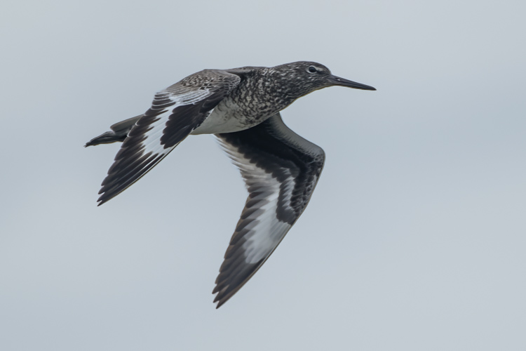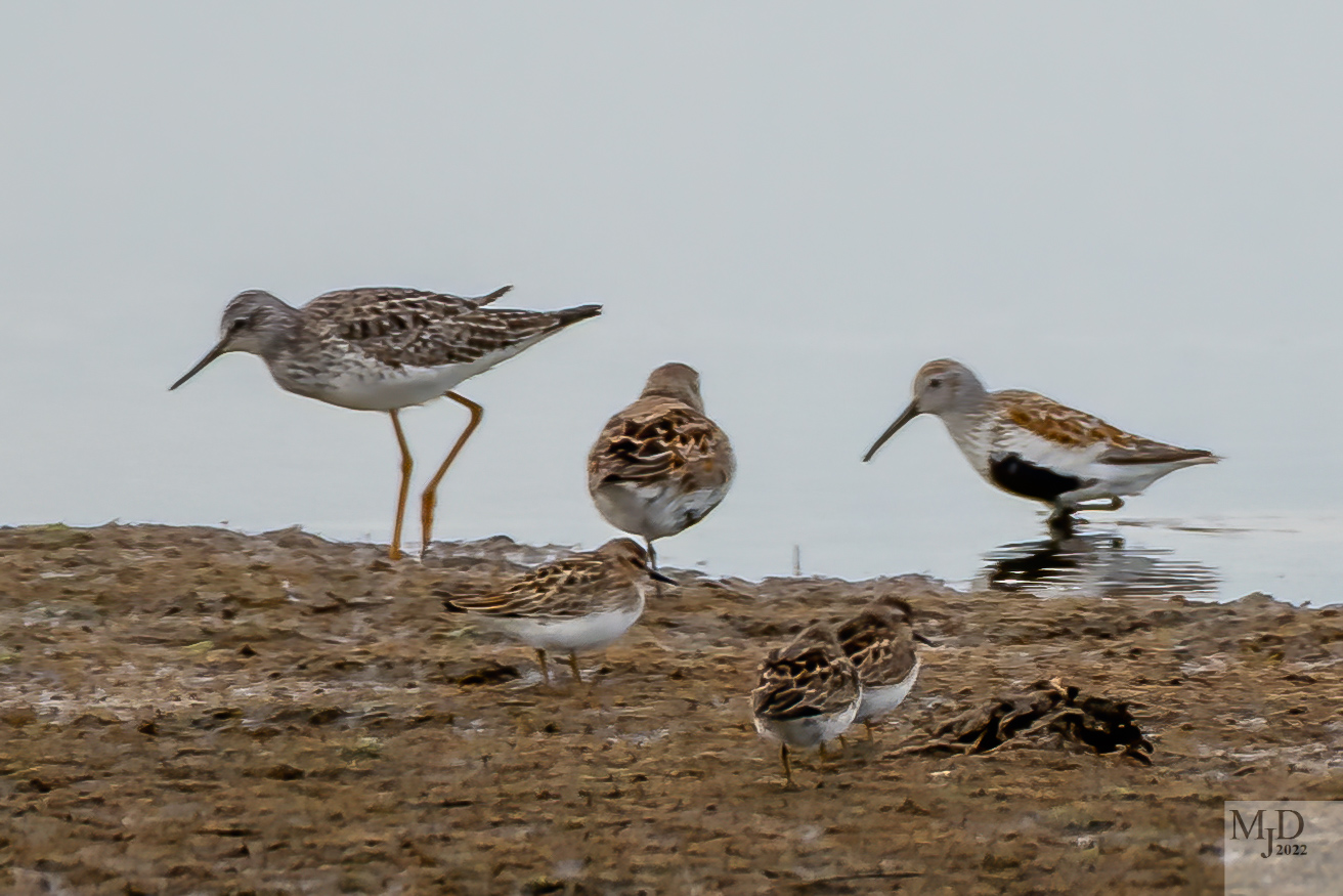The mud flats have plentiful invertebrates that attract all kinds of shorebirds and the birds often intermingle. This is a flock of Lesser Yellowlegs that was joined by a single Semipalmated Plover and one Greater Yellowlegs. The size difference between the Greater and Lesser is noticeable. The Greater Yellowlegs’ beak is also much longer in proportion to the head than the beak of the Lesser.