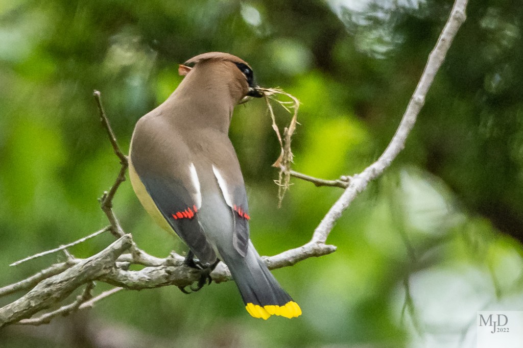 Sharing some recent sightings as migration slows and the residents settle in for the summer. This is a Cedar Waxwing carrying nest materials. People really like the soft colors with a couple of bold accents, the yellow tail tip and the red wax on the wings. The crest and black mask are a final touch. The red feather tips are a waxy secretion.