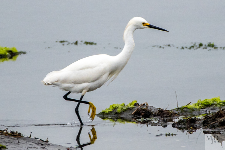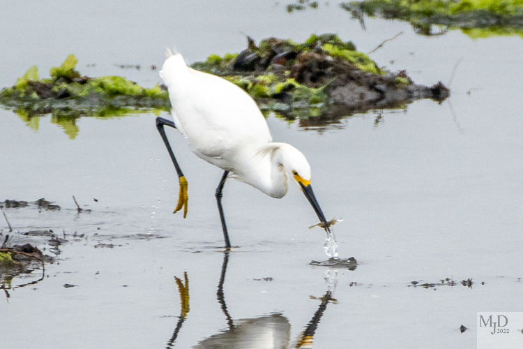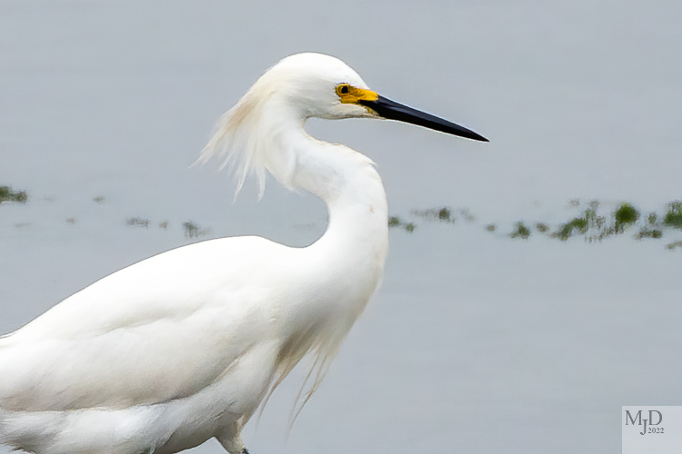 The Snowy Egret is a medium sized wader that is probably the most elegant of the wading birds we have here. Their breeding plumes are striking and were so popular for ladies hats that Snowy Egrets were nearly wiped out until they were protected in the early 1900s. Now their greatest threat is habitat loss as the wetlands that they depend on for food are shrinking. They are easily identified by size since Great Egrets, also white, are much larger. They a black bill and yellow feet while the Great Egret has the opposite pattern. Juvenile Little Blue Herons are all white and you need to look more closely to be sure which one you have but we seldom, if ever, get the two together up north. They are active hunters and will stir up schools of minnows to get a chance to grab some. These photos show the plumes, black beak and yellow feet.