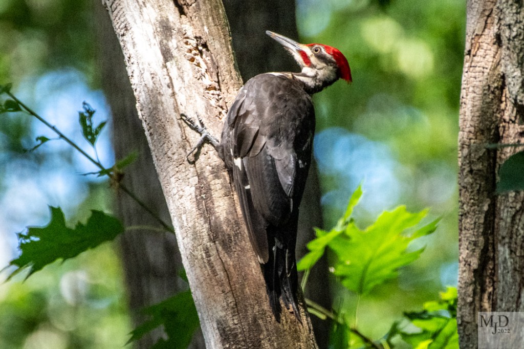 The name “Pileated” refers to that red crest. It comes the Latin pileatus meaning “capped”. This is a male, as distinguished by the red whisker.