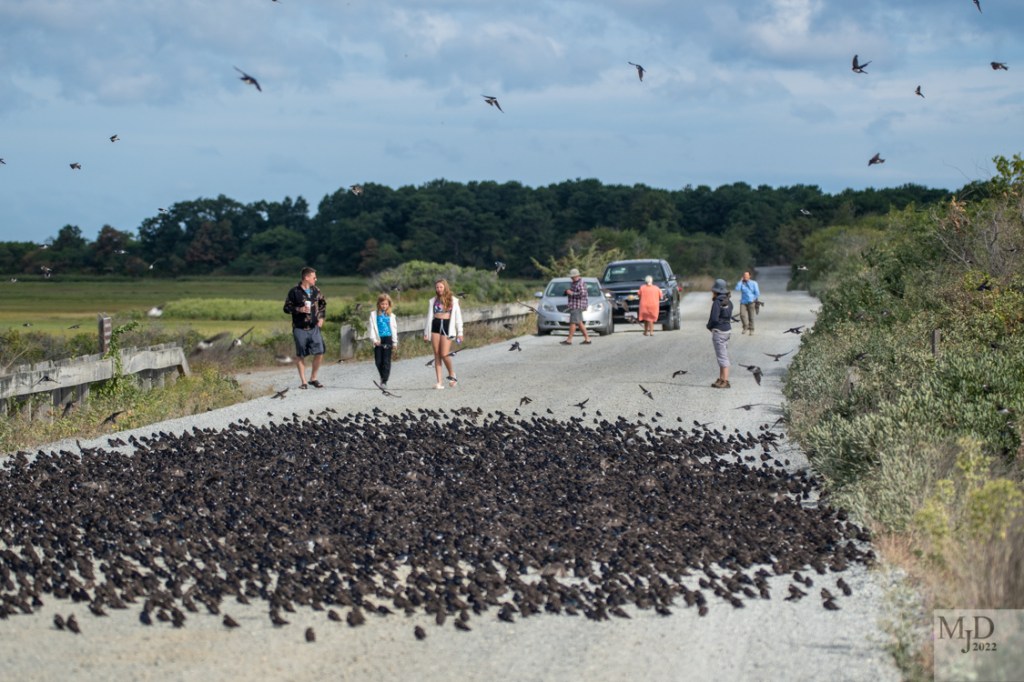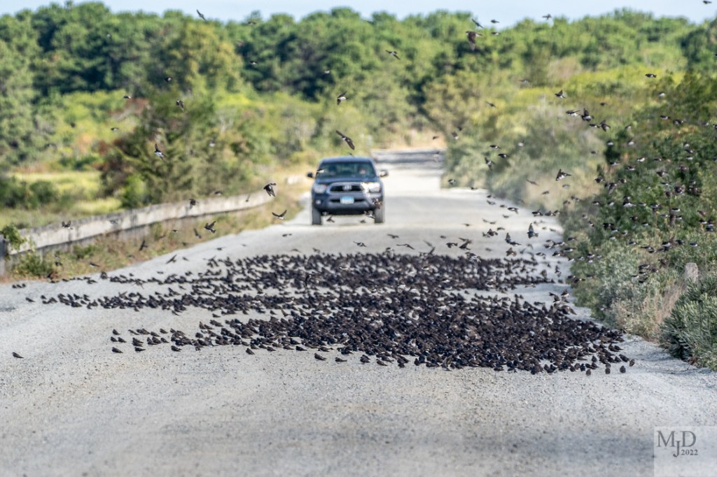 Why were the birds in the road? We often see them sitting in the sand or dunes on the beach so they seem to like a sunny open spot. A nor’easter was just pulling away this morning and the winds were pretty strong. Maybe they just didn’t want to fight them. Whatever the reason, they certainly stopped traffic!