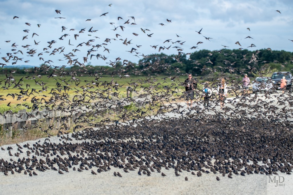 Tree Swallow activity continues to grow. This morning we were driving north from the southern end of the Island when I spotted a large dark area on the road ahead. We pulled over and looked at the 2000+ Tree Swallows sitting in the road with probably as many or even more in the shrubs and fields next to the road. (Note: I’m not all that good at estimating these things. The consensus estimate was about 2500 birds sitting in the road.) This is what I saw that made me stop and grab the camera.