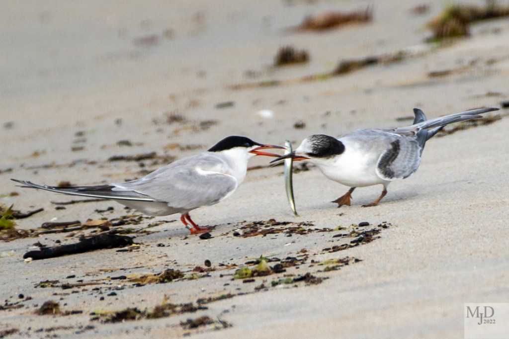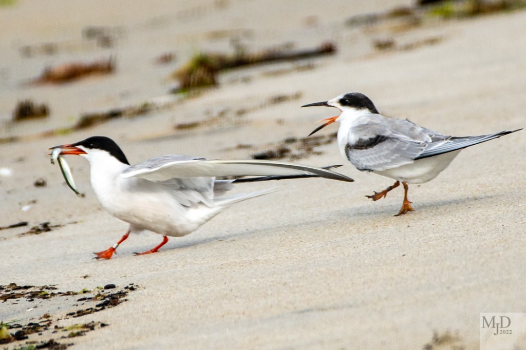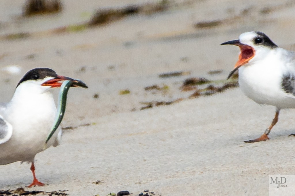 It is common for young birds to continue to look to their parents for support. I see it with all of the species that frequent my feeders, as well as the hawks that breed nearby. Young birds that are as big as their parents and are fully able to fly will follow the adults and beg for food. They flutter their wings, vocalize and open their mouths just as they did while in the nest. It takes some time before the parents stop responding to the open mouth and make the youngster completely fend for itself. This was the case for a young Common Tern that followed the parent as it flew back to the beach with its catch. It begged all the way to the beach and finally got the parent to surrender the fish it had caught. This is all instinctive behavior but feel free to frame it in human terms for fun if you like. The parent does look a bit frustrated to me.