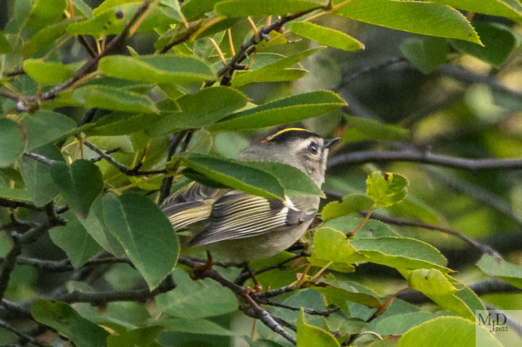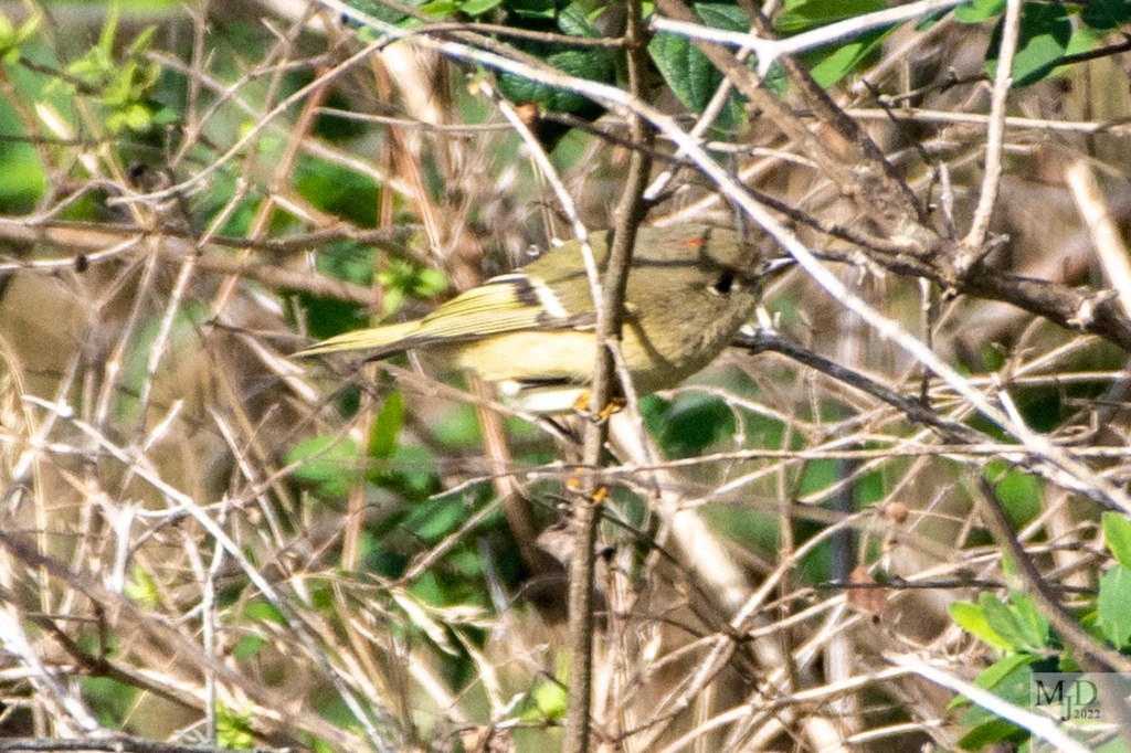 There are two species of Kinglet, a tiny bird that summers to our north and winters just south of us. We often see them together in the spring and fall as they move back and forth. They are very active and tend to stay deep in the foliage as they forage for insects. The first photograph is of a Golden-crowned Kinglet. The second is a Ruby-crowned Kinglet. The ruby colored feathers are just barely visible on the Ruby-crowned Kinglet’s head because they only raise the feathers when they are excited.