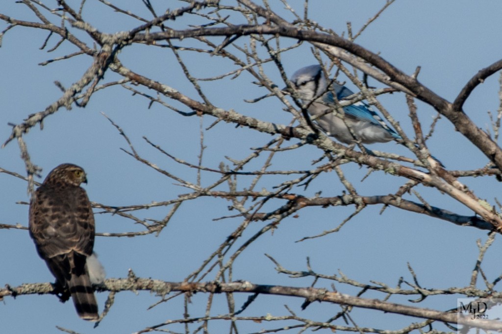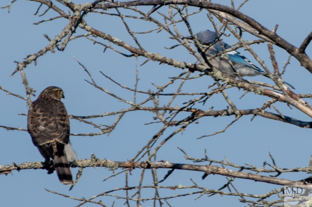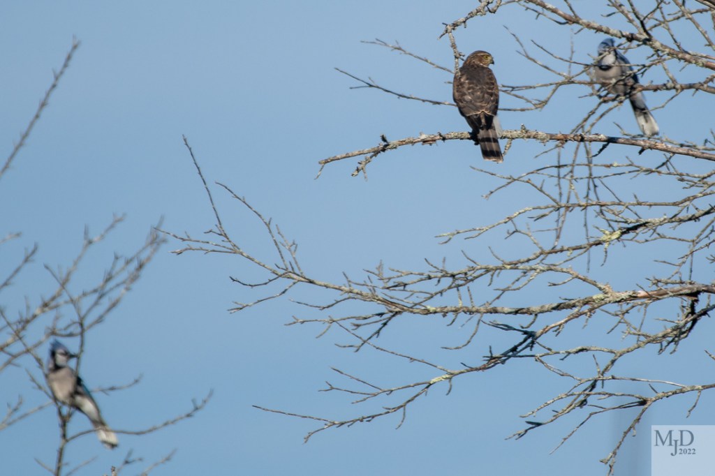 The Jays chased the hawk out of the tree, back to the tree and finally out of the area. The chase took place through the trees so I could not capture the action with my camera unfortunately. This is the last time the hawk perched before beating a retreat for good.