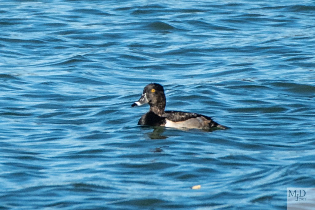 There were a few Ring-necked Ducks mixed in the Ruddy Ducks. You might think that they would be “Ring-billed”, not “Ring-necked”. They do have a very hard to see chestnut ring around the neck and early biologists named them using the dead specimens that they collected. But still, look at the ring on the bill! They winter further south.