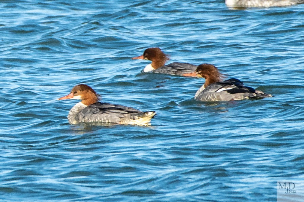 The numbers of Common Merganser are still low. A group of females got close enough for a photo. They have a slender serrated bill for grabbing and holding fish. The females have a small crest for a swept-back “hair style”. These ducks winter here so we will see them often.