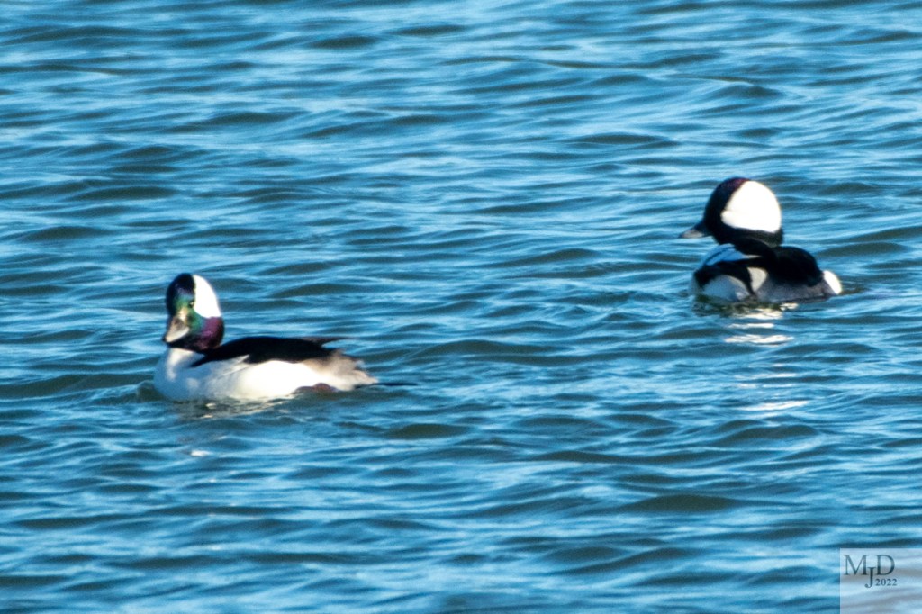 Buffleheads spend the winter in the US, including in my area. They breed in northern Canada and Alaska. They are a small diving duck with a large head. They tend to bob on the water and look like a toy duck. The dark area on the male’s head has green and purple highlights in the right lighting. The females have a white cheek patch.