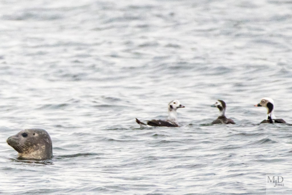 I waited for a trio of Long-tails to surface so I could get a group shot. I got the male, female and immature male together but a Harbor Seal photobombed the shot. The ducks are wondering where the guy with the whiskers came from.
