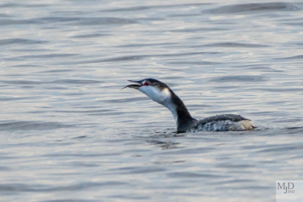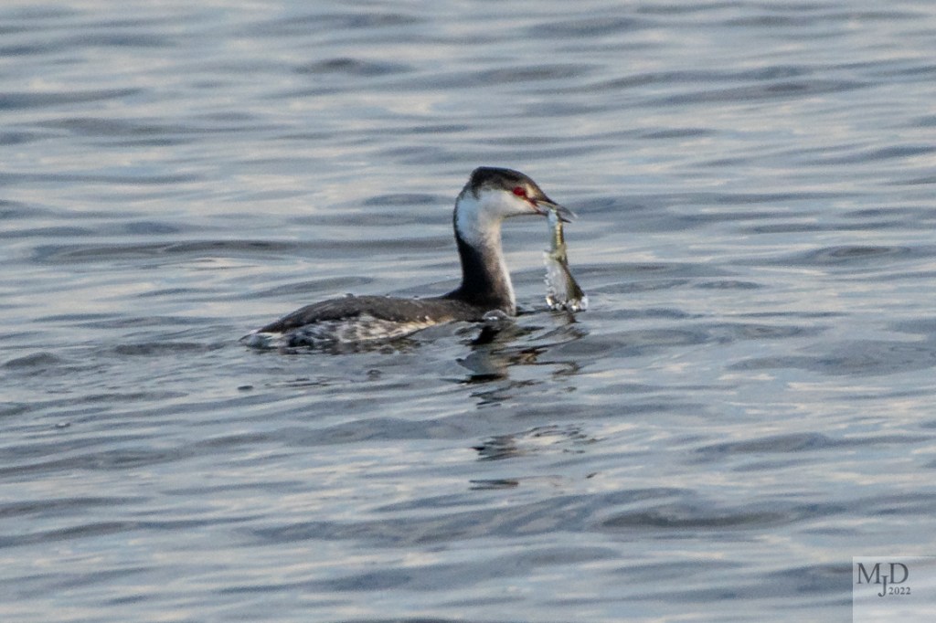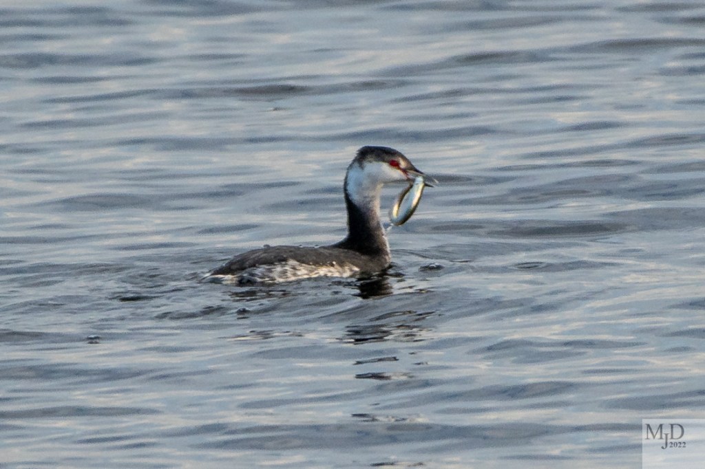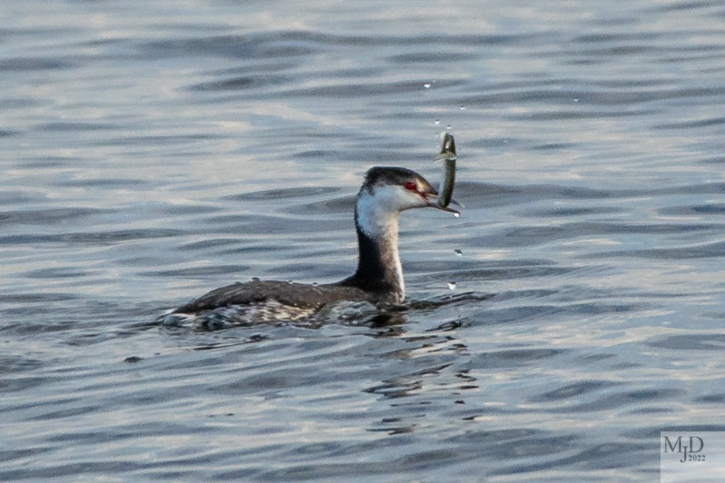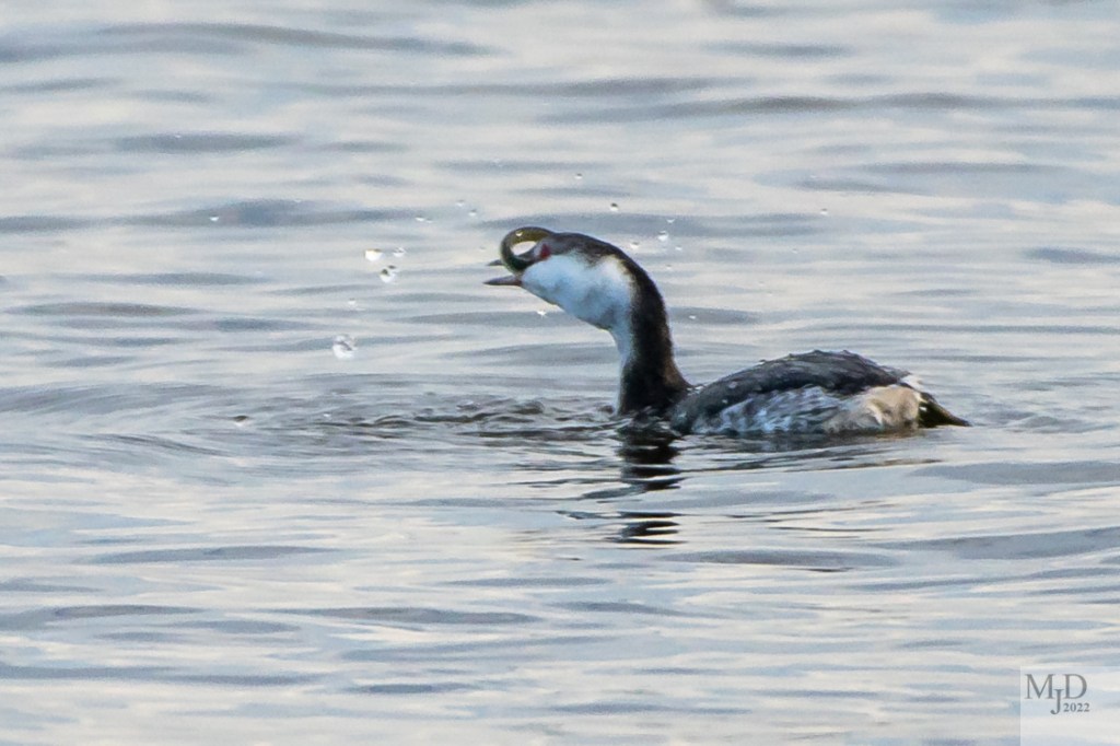 This sequence of photographs shows a Horned Grebe feasting on a Sand Eel. It has to position it so it can swallow it head first. I think they also try to stun it as well. So there is a lot of thrashing around. (Yes, one Sand Eel perished in the making of this post.)