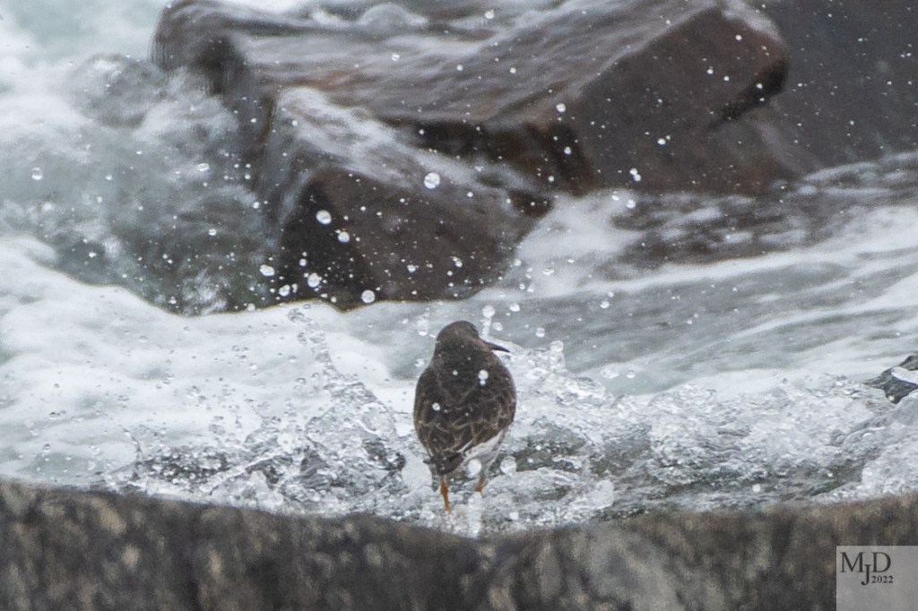 Purple Sandpipers spend the winter in rocky shore areas from the Canadian Maritimes down to the Mid-Atlantic coast of the US. They seem to enjoy being right at the very edge of the surf. They can also blend in the rocks and are difficult to spot unless they move around. It sometimes seems as if they appear by magic as you carefully scan and begin to pick more and more of them out in a spot where there were none just a minute ago.