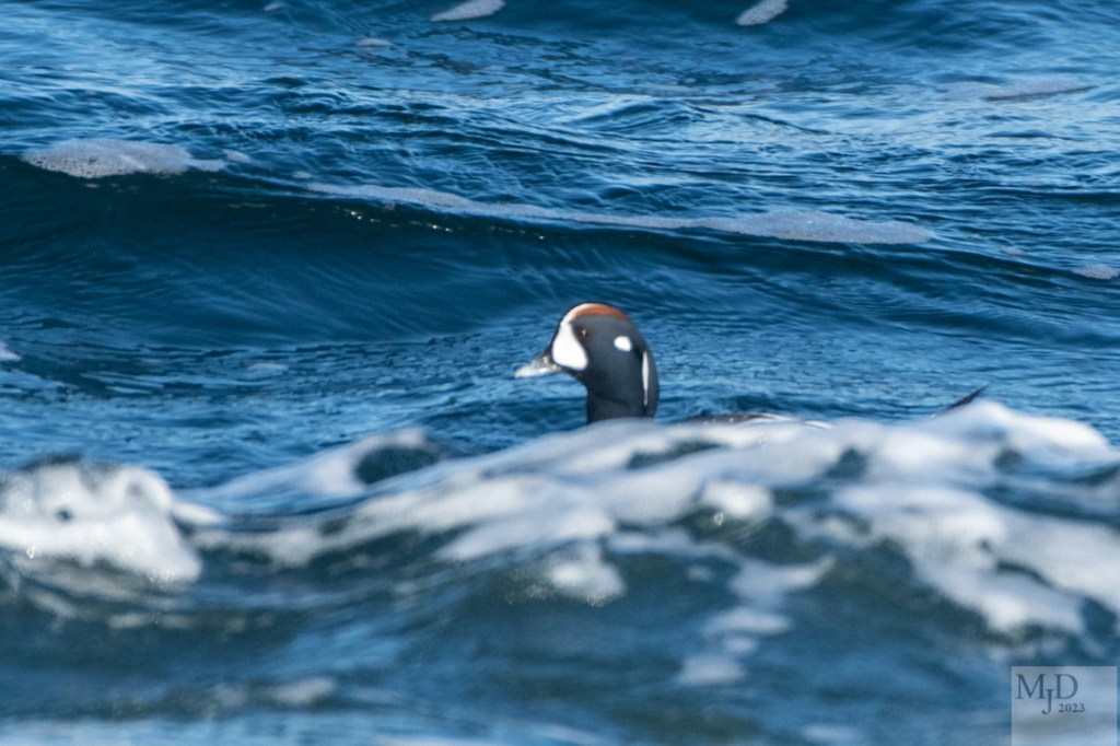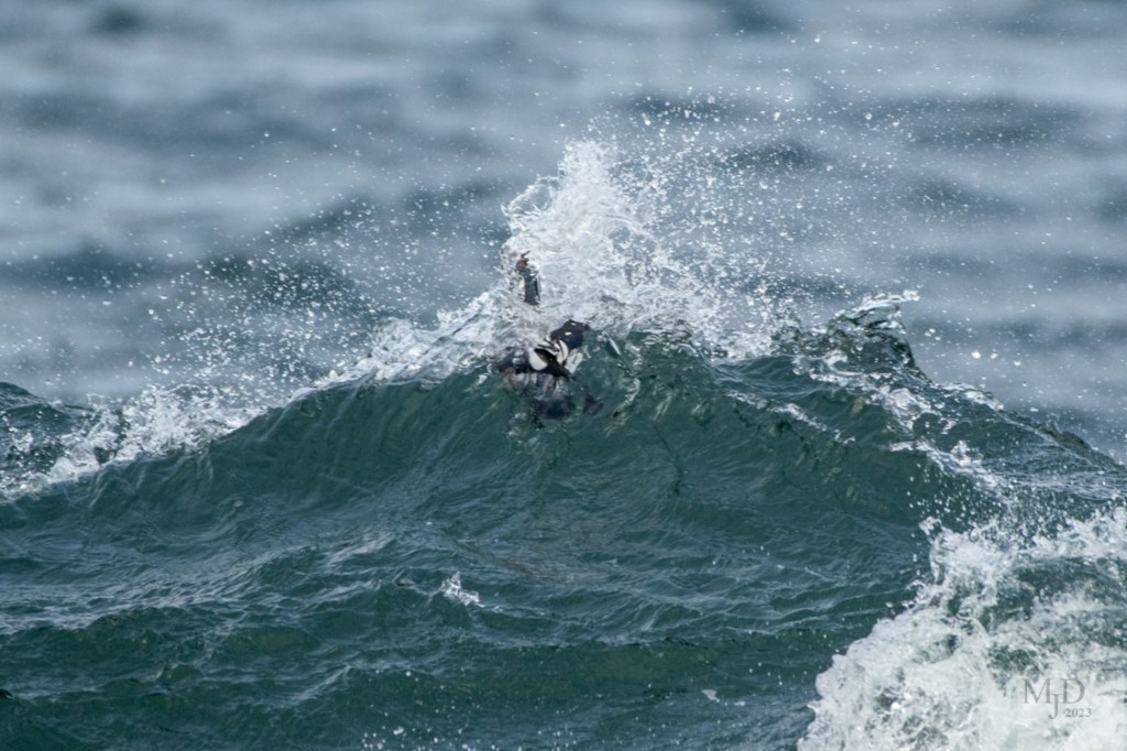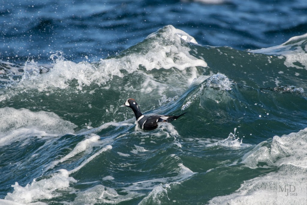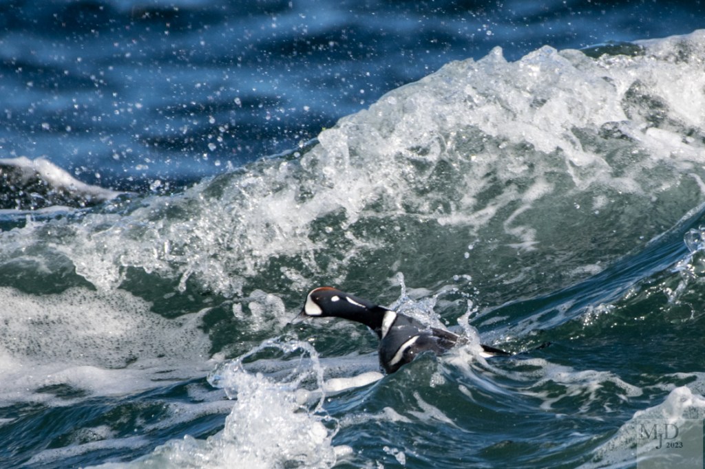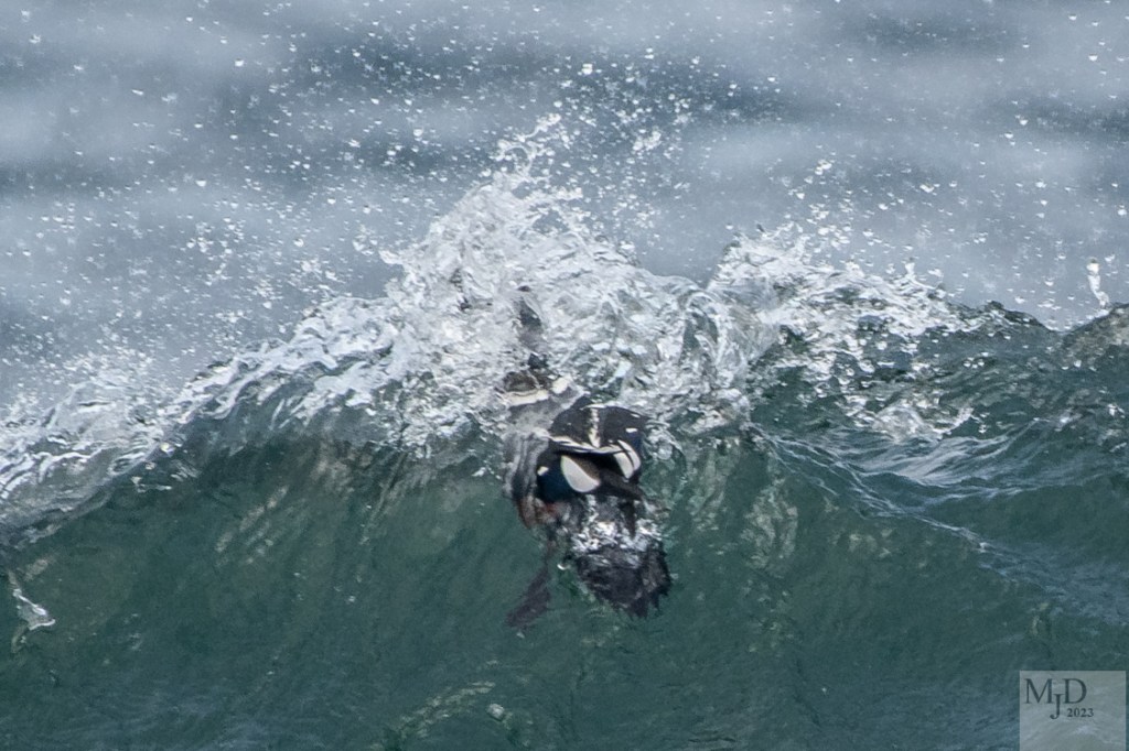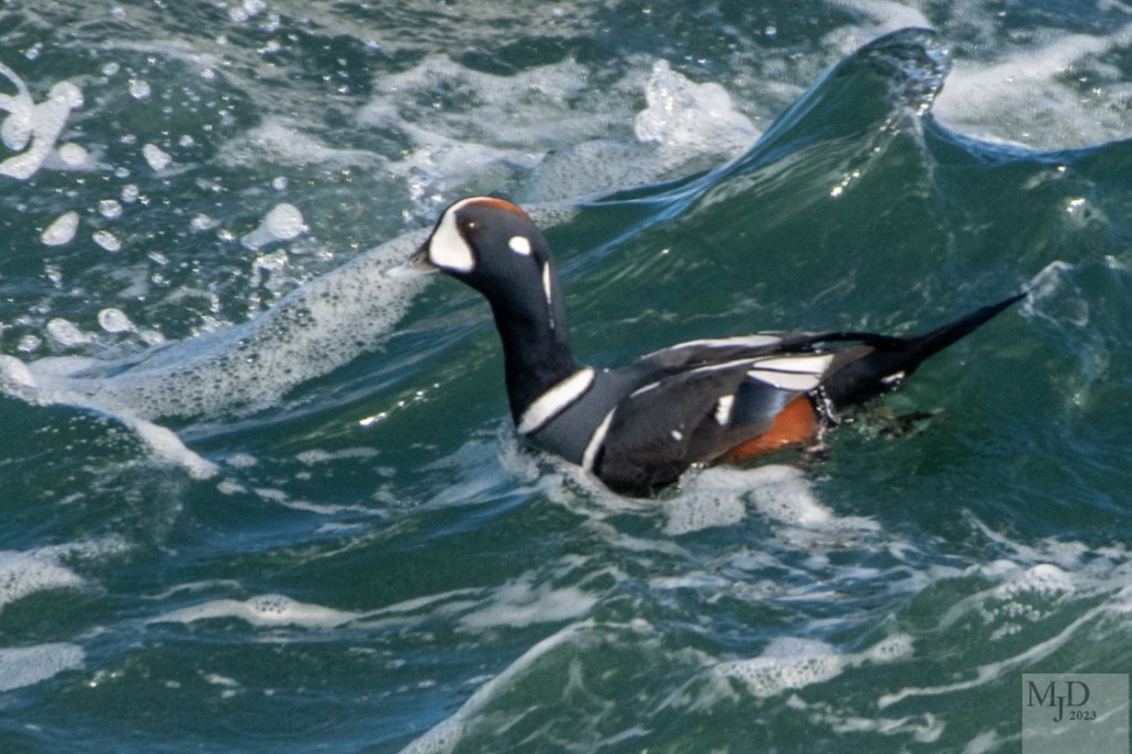 Harlequin Ducks are noted for the male’s colorful plumage. But they are also well-known rough water lovers. They feed close to rocky shores in heavy surf in the winter and in turbulent streams and rivers in the summer. Broken bones are quite common among these ducks. This is a male I photographed riding heavy swells where they were breaking on the rocks.