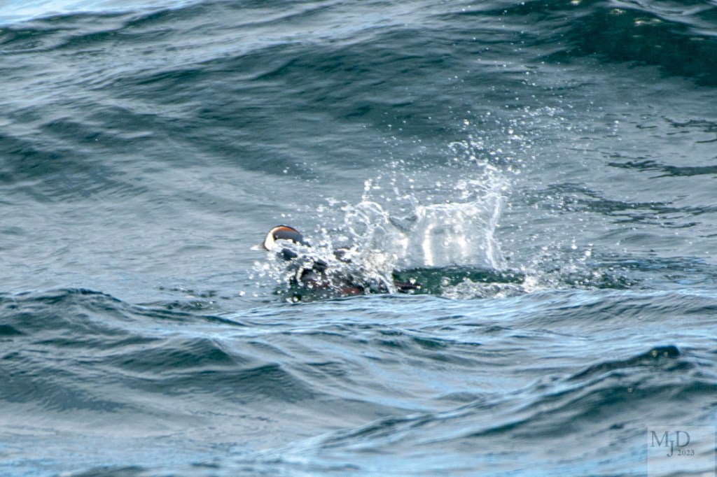 Some Harlequins were out further from the shore. I captured this one landing and temporarily vanishing in a trough.