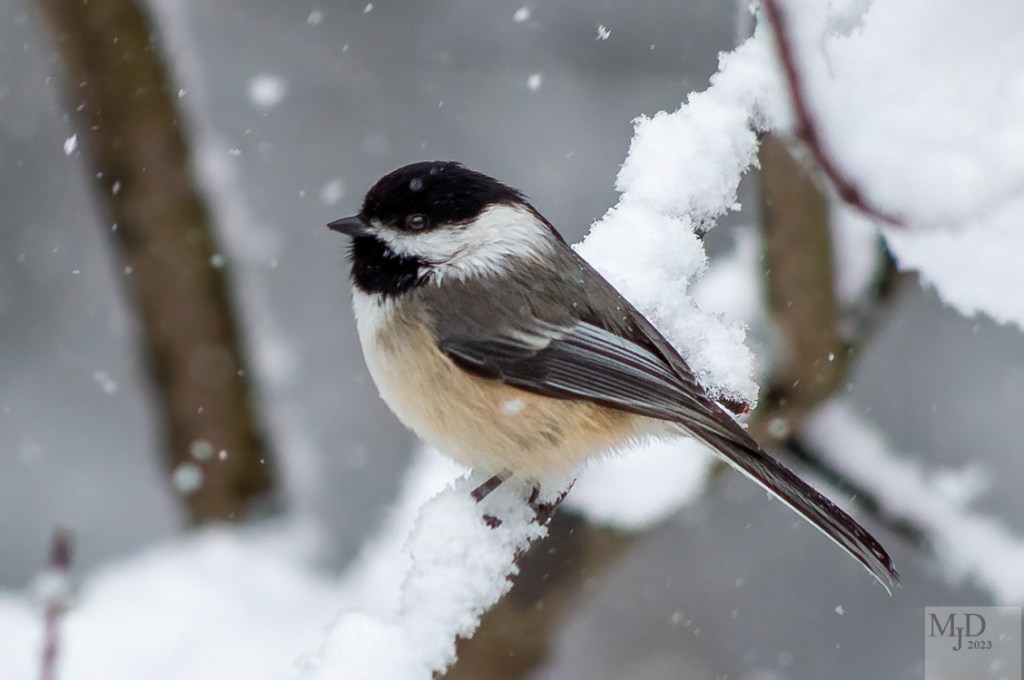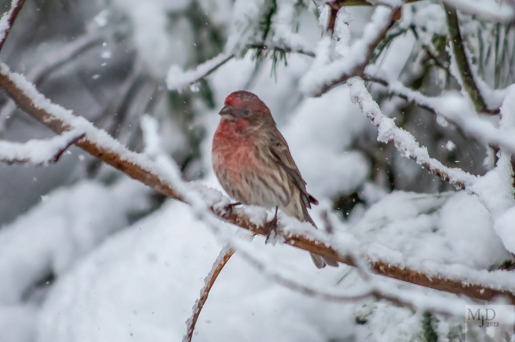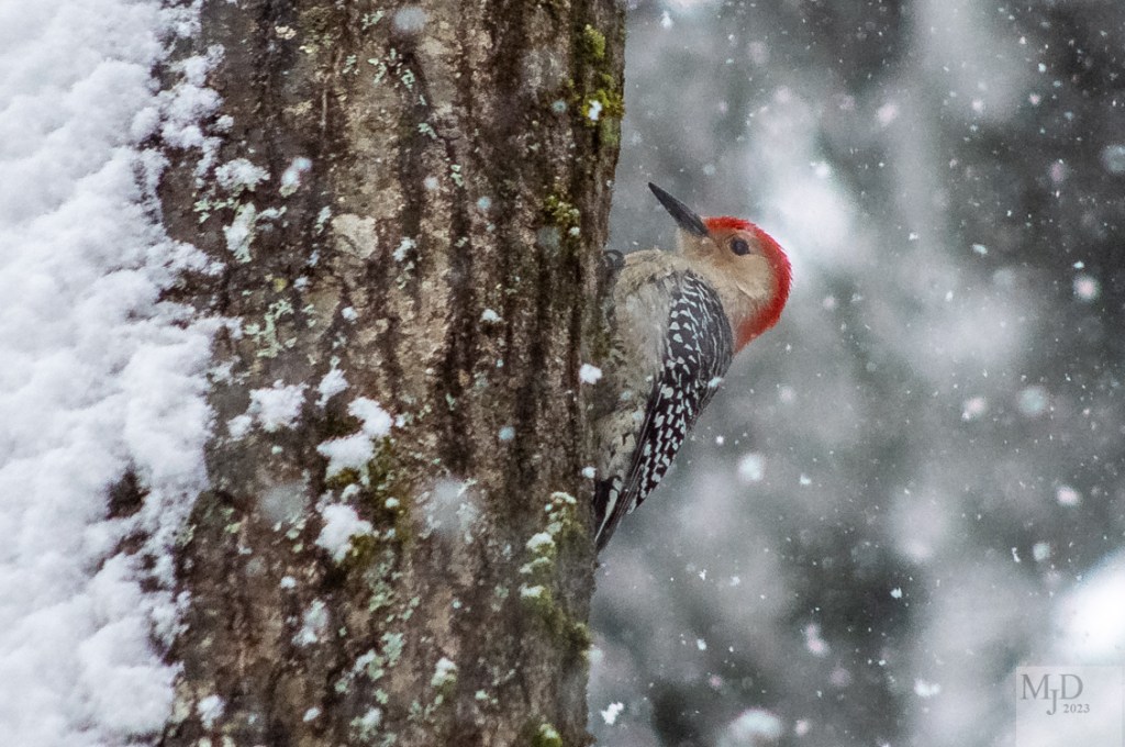 The camera had a hard time focusing on this Red-bellied Woodpecker as snowflakes fooled the sensor. This large woodpecker is a year round resident.
