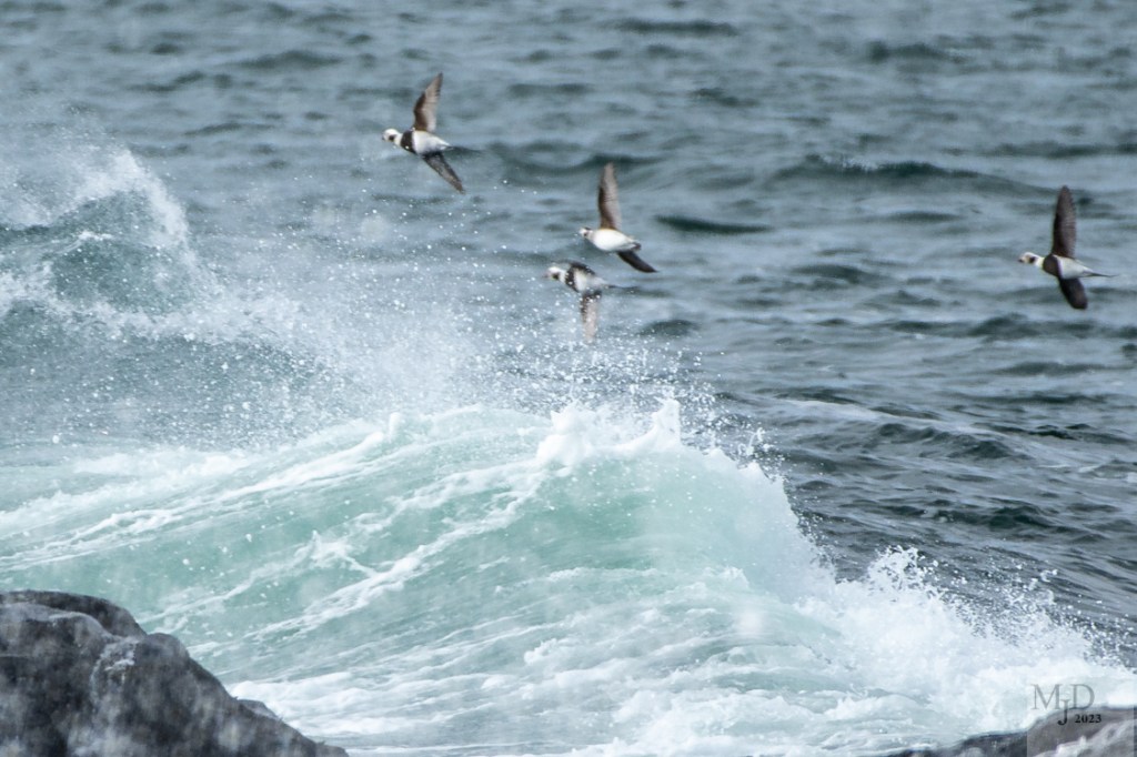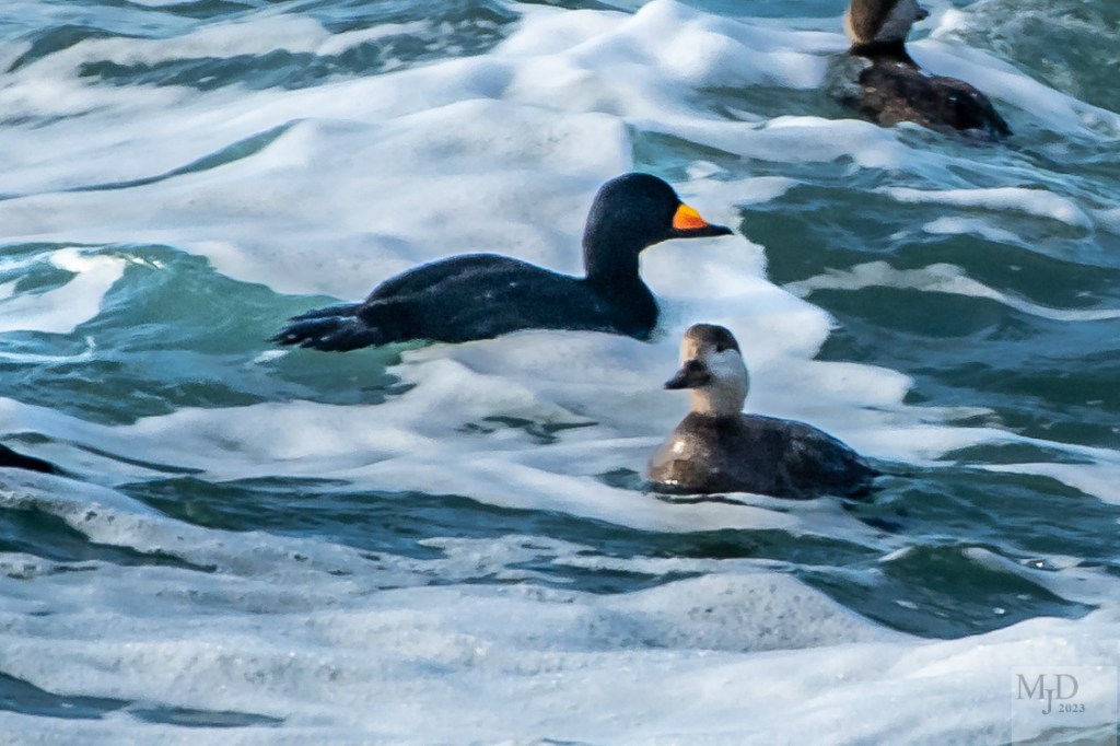 Black Scoters were riding the swells close to shore. The spray from the waves hitting the rocks between me and the birds looks like snowfall. The males were calling the entire time I was there. It is a very distinctive sound and there were several people recording them on their smart phones. Check the Cornell Labs website or Google Black Scoter call/song if you want to hear what it sounds like.