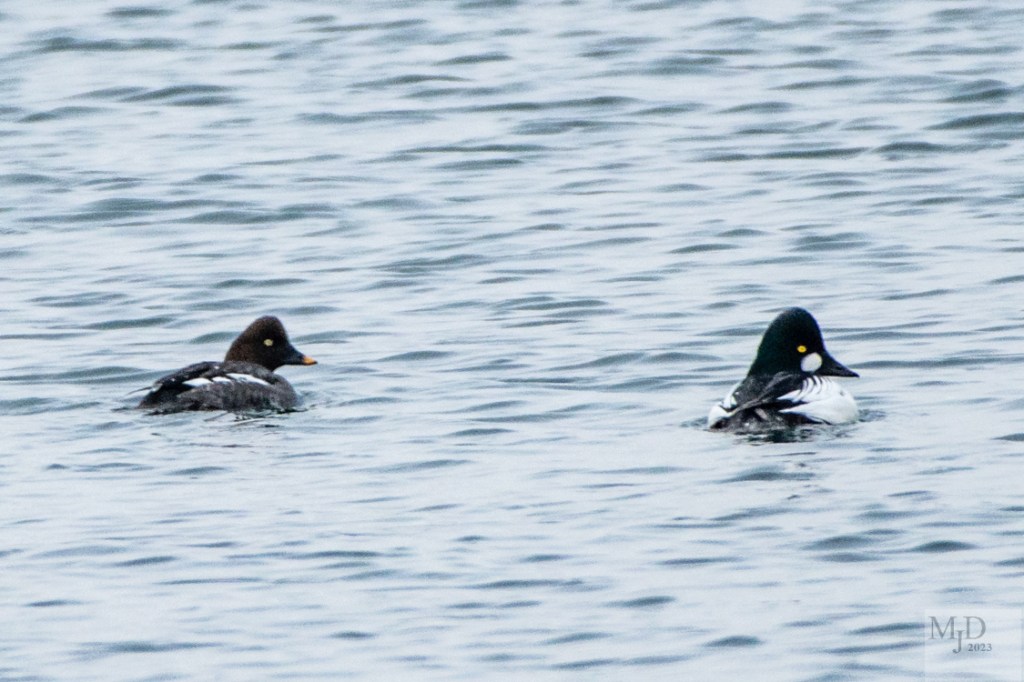 The wintering ducks are still around but will start moving inland and north soon. This is a pair of Common Goldeneye, female on the left and male on the right.