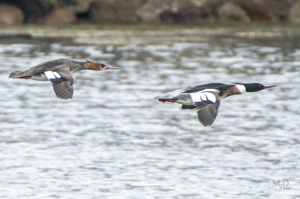 This looks to be a successful pairing of Red-breasted Merganser that I photographed as they flew past.