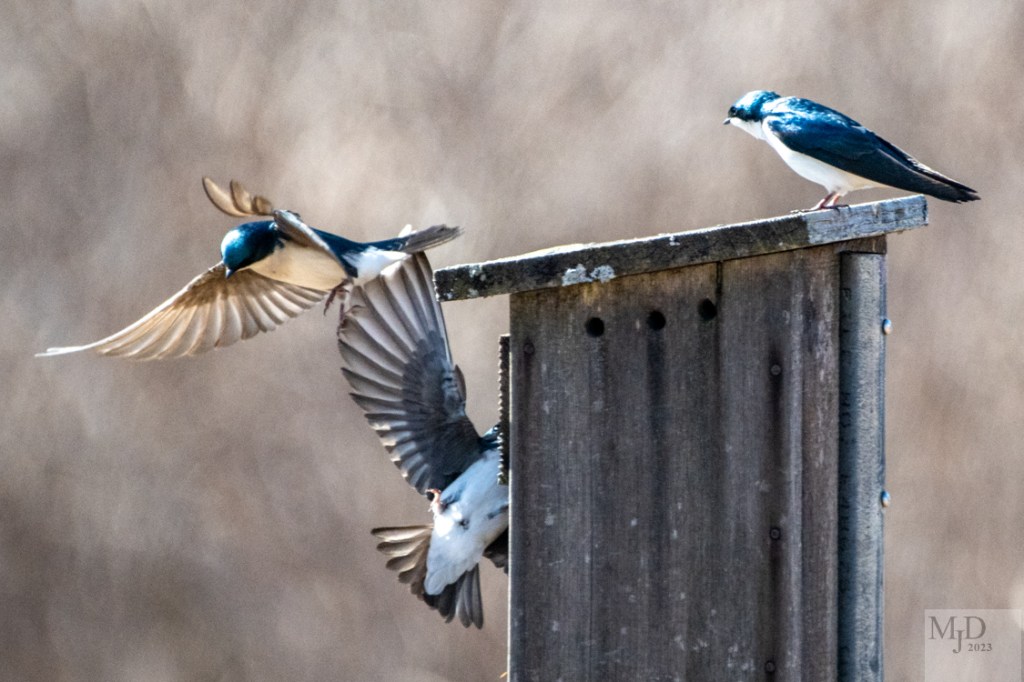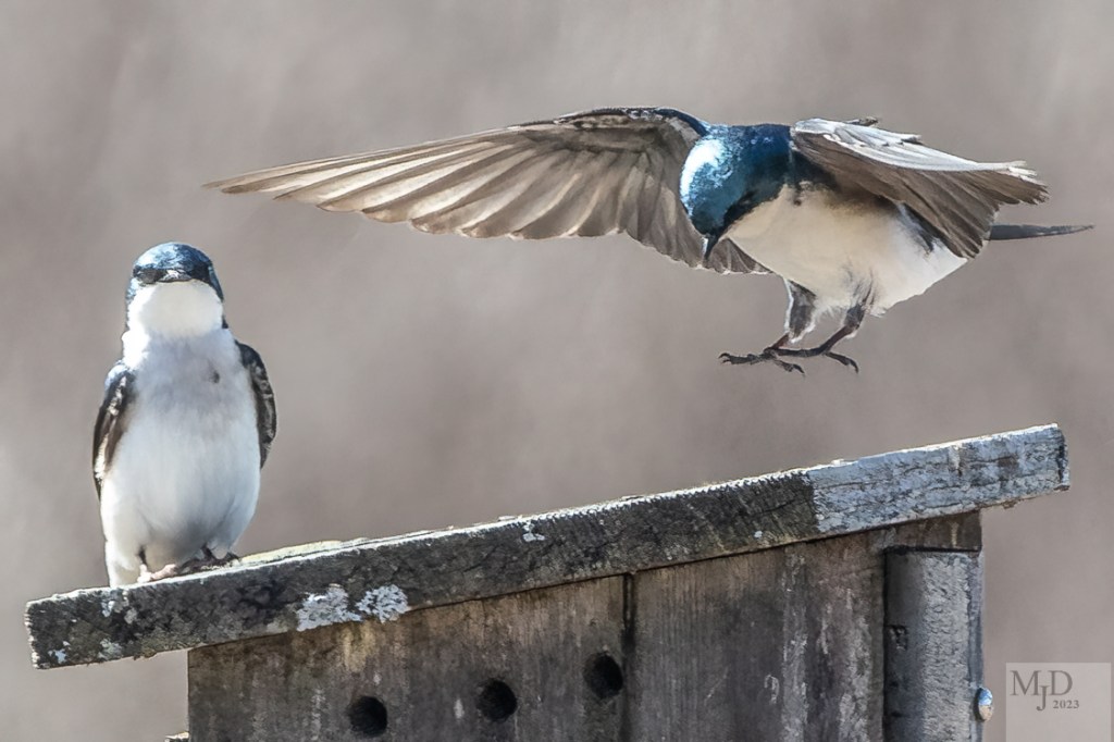 They are called Tree Swallows because the nest in small holes in trees. They also like nest boxes and this is where I found them. I like to try to catch them in flight. It is a frustrating experience since they dart erratically through the sky as they chase insects. Any non-blurry picture is a win! However, there was a bit of a dispute over one particular box and I was able to get some action shots during the ensuing kerfuffle.