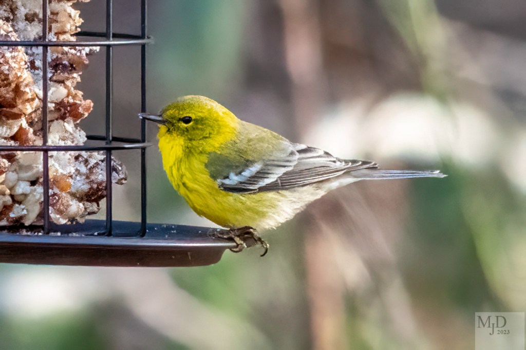 This is a newly arrived summer resident from the southeastern US. A Pine Warbler is checking out the fruit and nut selection at my “diner”. And it’s my first warbler sighting of 2023.
