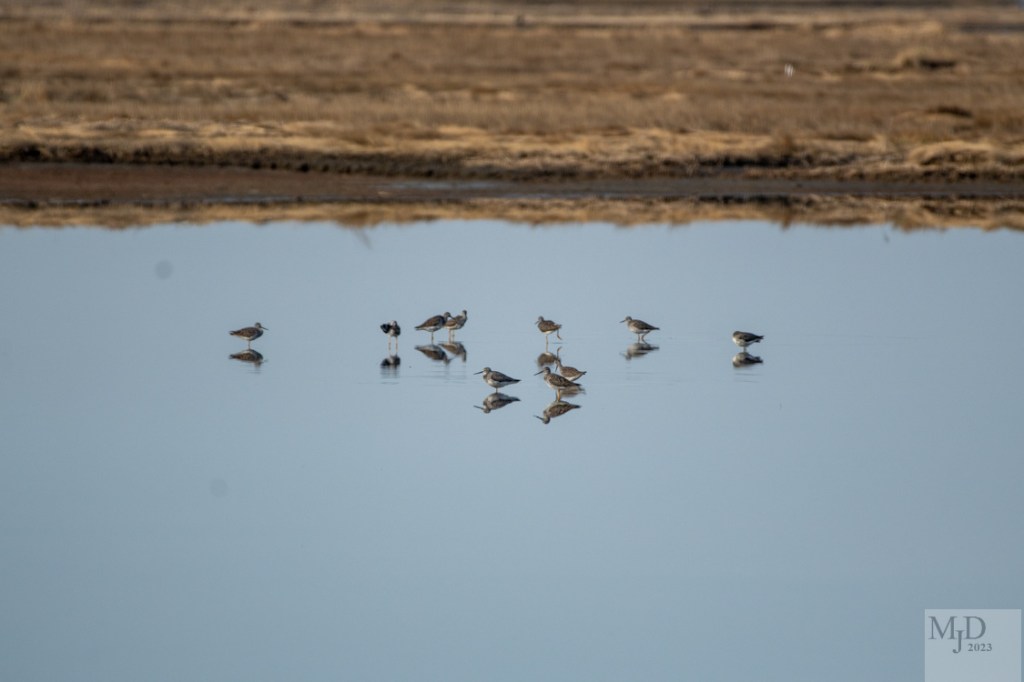 The weather was exceptionally nice for an early spring day at the coast on an Audubon group walk. The wind was nearly dead calm and that is a very rare situation when less than 400 meters of trees and dunes is between you and the Atlantic Ocean. The salt pannes were as smooth as glass and acted like a mirror as you can see in this photograph of some Greater Yellowlegs.