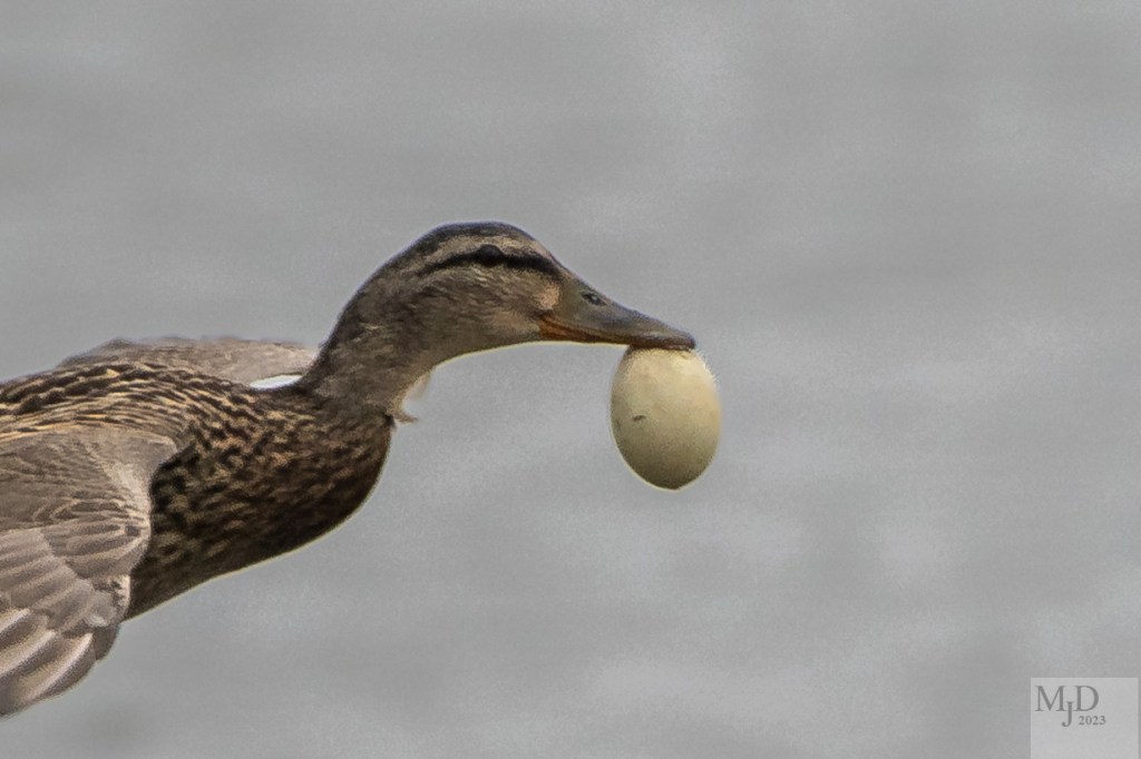 I spotted a duck flying across a pond and began photographing it as it flew toward and past me. I could see in the viewfinder that it had something large in its bill as I was tracking it. I was surprised by what I was seeing when I checked the photographs on my camera display. But the processed photos confirmed that the female Mallard was carrying an egg. The egg was intact except for a small opening that allowed the Mallard to hold it in her bill. This is what I saw and the photos were the subject of a query to the Cornell Labs. This was probably the strangest bird behavior I had ever seen.