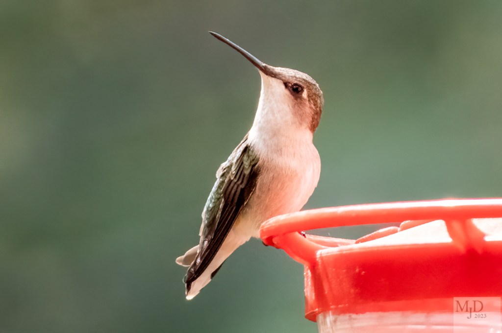 I just had my first sighting for the season of a Ruby-throated Hummingbird at my feeder. It’s a female, so no ruby throat. I will try to catch a male in viewfinder. It is nice to have them staying with me for the summer again.