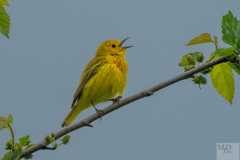 Yellow Warblers were the subject of a post I made not long ago. They breed in our area and we see them all summer. This one perched on an open branch in order to proclaim his territory. That provided an opportunity for some unobstructed photographs. The reddish-brown streaks indicate that this is a male.