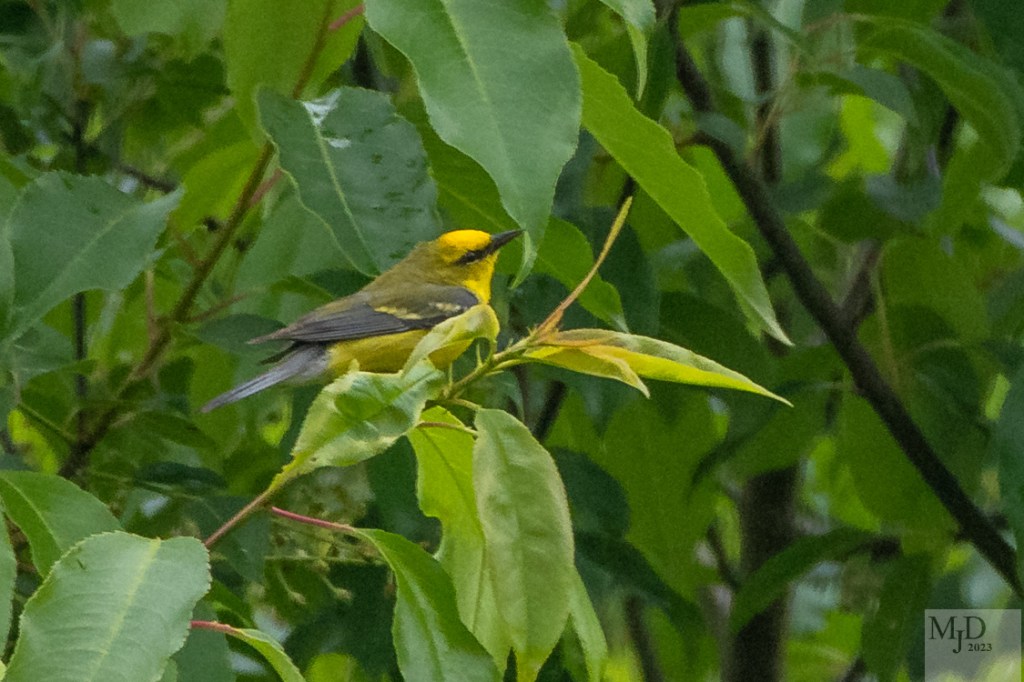 Blue-winged Warblers are yellow below, yellow-green above and have blue-gray wings with two bars. They have a black eyeline that is lighter in females than in males.