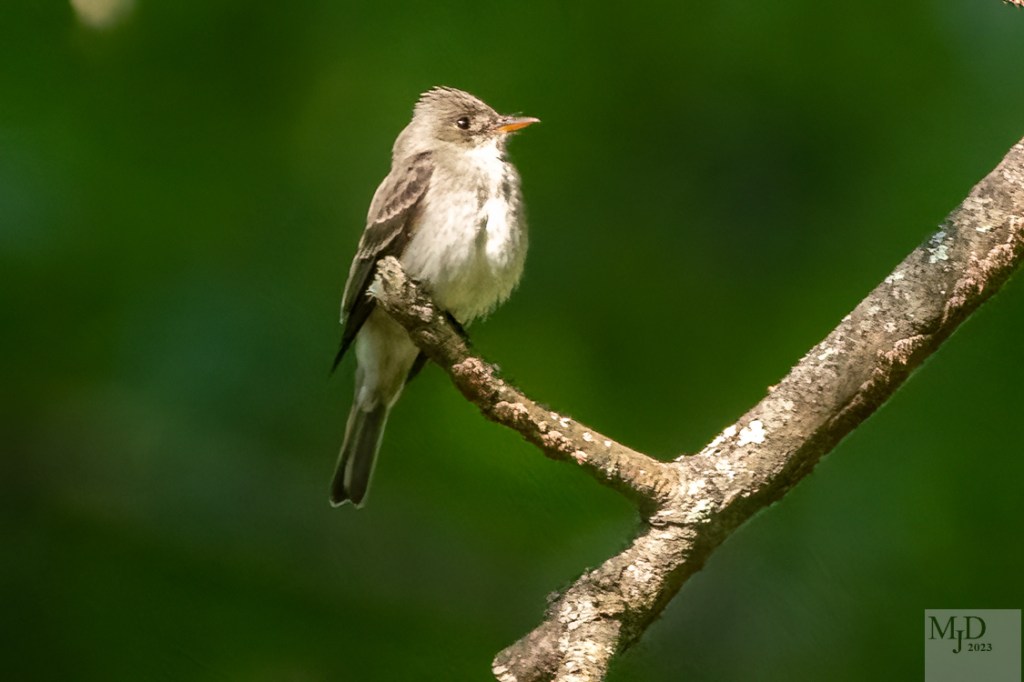 The Eastern Wood-Pewee is a flycatcher that breeds in the eastern US and winters in northern South America. It’s not particularly small and size is not the inspiration for its name. It is named for its call, “pee-a-wee”. Like many flycatchers, it likes to perch in an open position where it can watch for insects to pounce on. It will return to the same perch many times while hunting insects. I was able to stand fairly close to one and watch it go after insects, return to its branch, dine and then look for more.