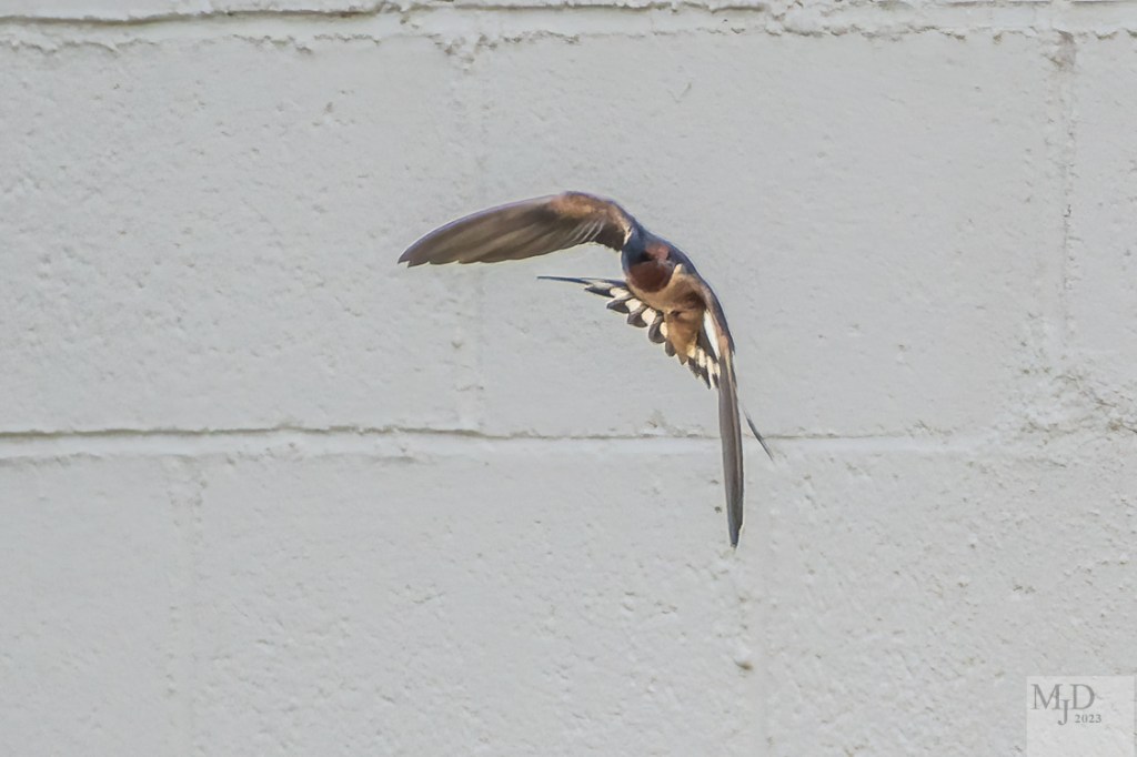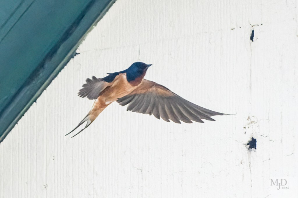 They have a small beak, typical for Swallows. They are blue on the back with a tawny colored underside. I spent some time trying to capture them flying in and out of their nest sites. These inflight photos of varying sharpness highlight their colors and forked tails.