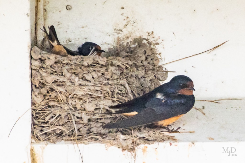 Most of the Swallows that I see zooming erratically through the sky as they chase flying insects are Tree Swallows. But if I look carefully I will see another type flying among them. This one has a deeply forked tail that immediately identifies it as a Barn Swallow. They build their nests on buildings and they nest at the maintenance buildings on the Parker River NWR every summer. This is a pair using a refurbished nest from last summer.
