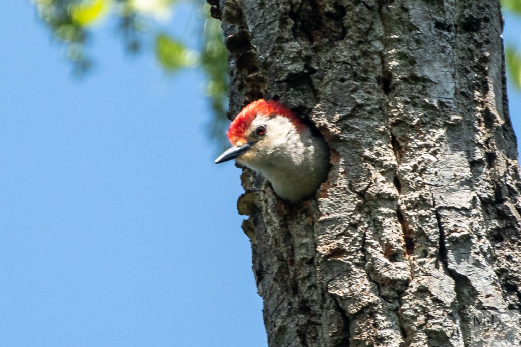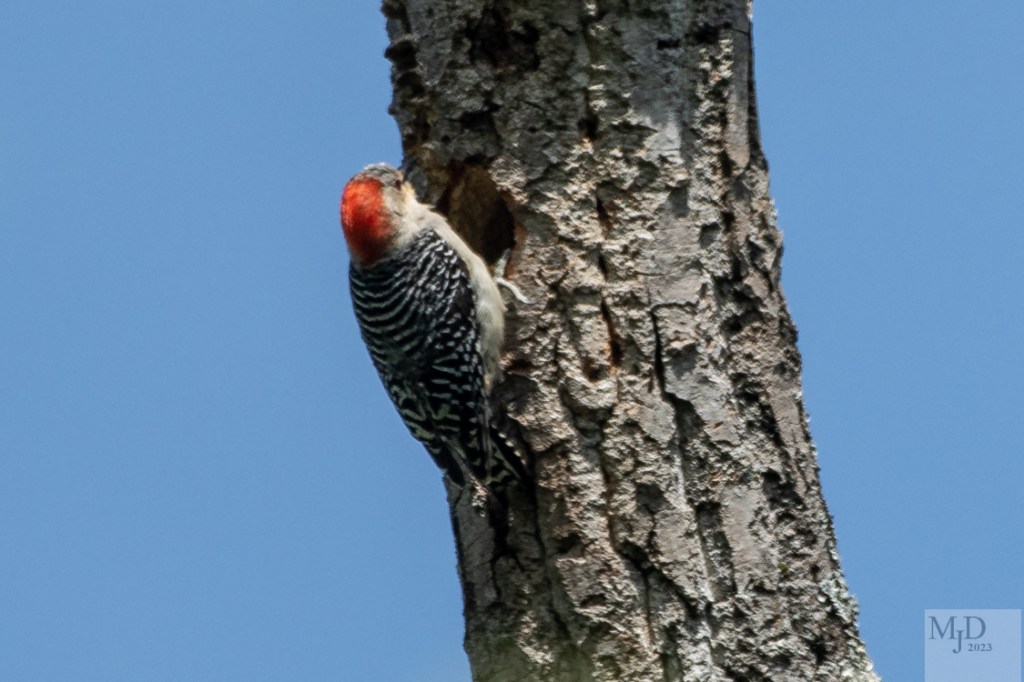 This is a natural nest site that has been used by Red-bellied Woodpeckers for at least the past three seasons. The female is perched outside. Later, the male pokes his head out. Note: females have a white forehead while the red extends all the way forward in males.