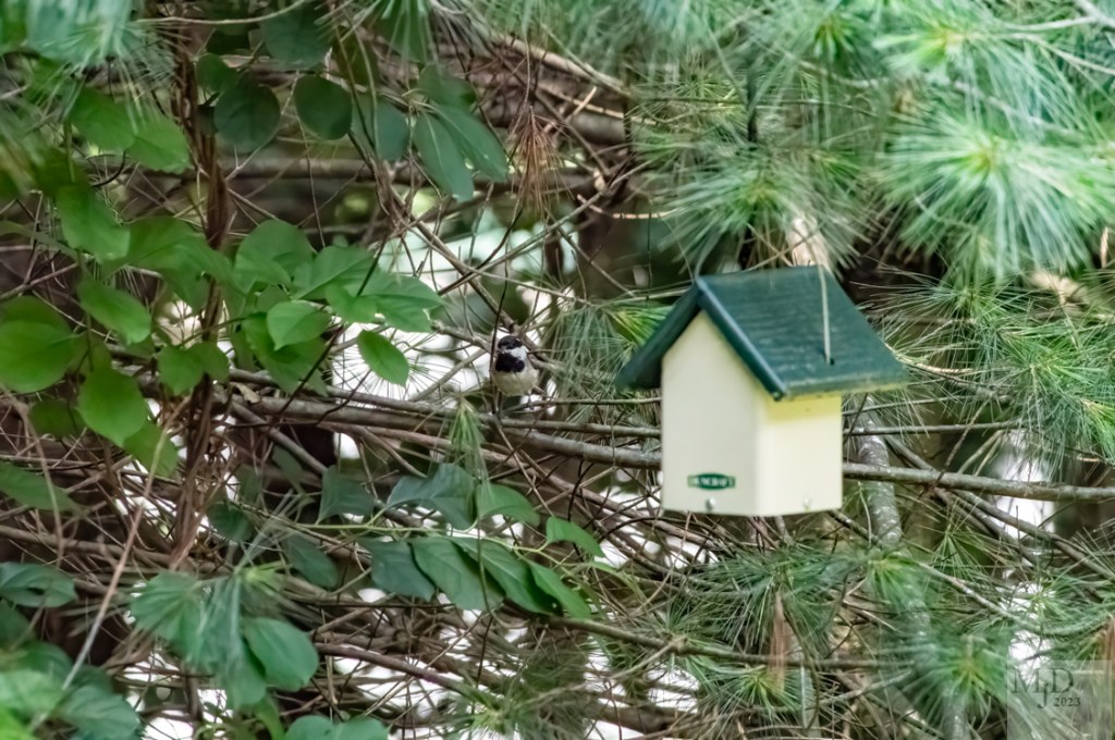I put up a nest box among the branches of a pine tree on the edge of the woods about 20 feet from my porch. My hope was to attract the Carolina Wrens that visited my feeders during the winter. When I received a good scolding from Chickadees as I was doing some work around the porch, I realized that they had moved in first. They aren’t frantic when pass by the nest area but make it clear that I should just keep moving along. I will limit my activities in their vicinity until the new birds fledge and move the box further away in the late fall when I clean it. This is one of the parents waiting to bring some food into the nest.