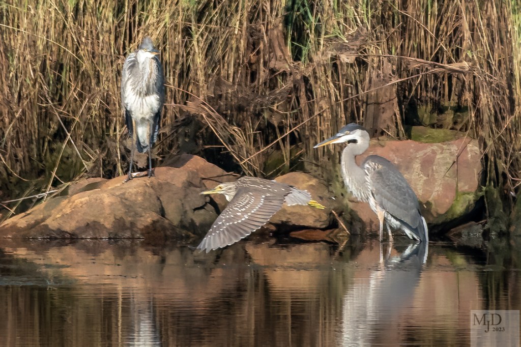 A Night Heron flying past some Great Blues….