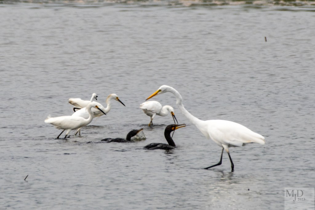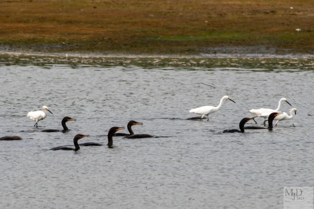 This is a little update to the post I made a week ago about a Snowy Egret and a Yellowlegs foraging for food together. I noted that larger groups of egrets, yellowlegs and cormorants will work together to herd schools of fish. This is a small group of Snowy Egrets and Double-crested Cormorants chasing a school of minnows that I photographed a few days ago. The second shot includes a Great Egret that was in their path and took advantage of the situation as it passed.