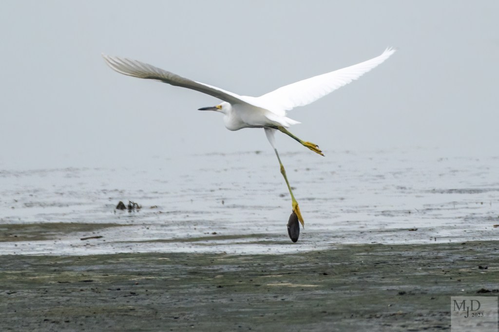 I was photographing egrets and shorebirds and took some photos of a juvenile Snowy Egret flying across the water. If it was an Osprey, I would think it was carrying its catch. But egrets don’t capture prey and fly off with it. They just swallow it right then and there. It seems that this egret somehow ended up with a mussel clamped to one of its toes. If only it could talk. Then we would know how the heck this happened. Although it might be too embarrassed to talk about it! My best guess it that it was probing the mud with its foot to find small invertebrates or stir up small fish and stuck the foot into the mussel. They do not eat shellfish so it wasn’t looking for it.