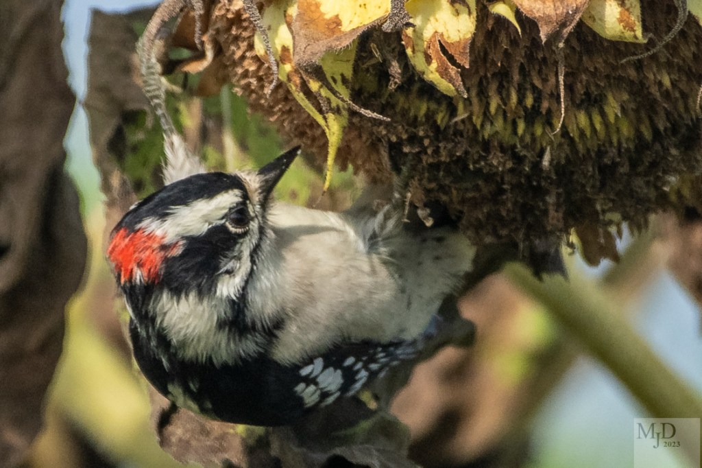 This is a Downy Woodpecker taking seeds from an end-of-the-season sunflower plant. Why bang your head digging out grubs from a tree when you can just nibble on some nice sunflower seeds?
