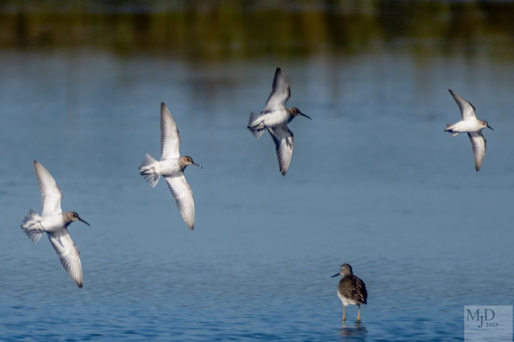 Three shorebirds winter along our coast while other species only pass through on their way south to winter in warmer places. One winter visitor is the Dunlin. It’s a bit chunky and has a somewhat long, drooping bill. The smaller birds with shorter bills in these photos are Semipalmated Sandpipers.