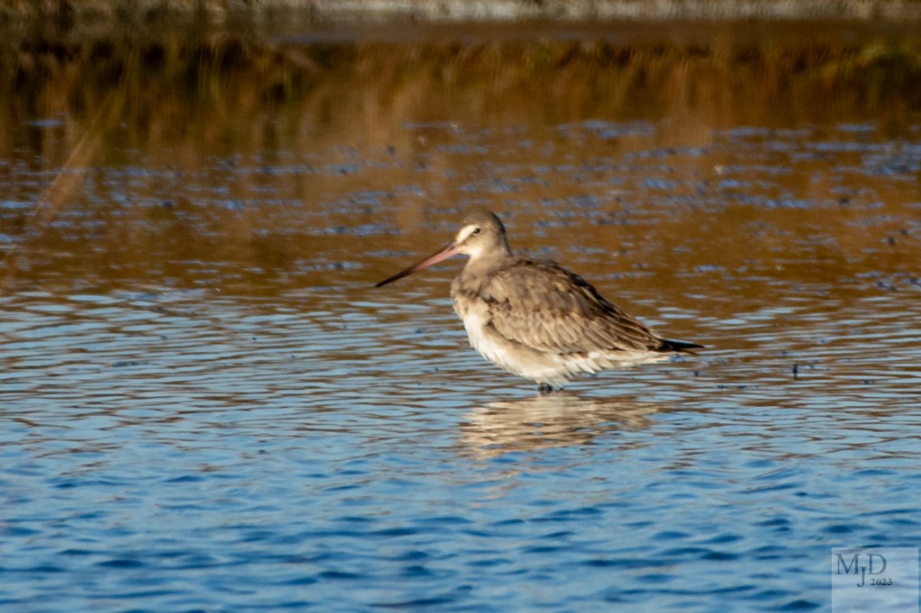 This is a juvenile Hudsonian Godwit that I photographed recently. These large shorebirds breed along the Arctic and Hudson Bay shores of Canada and stop here in New England on their way to their winter quarters in the very southern part of South America. Going almost pole to pole requires refueling stops. This one was busy preening and its feathers are puffed up.