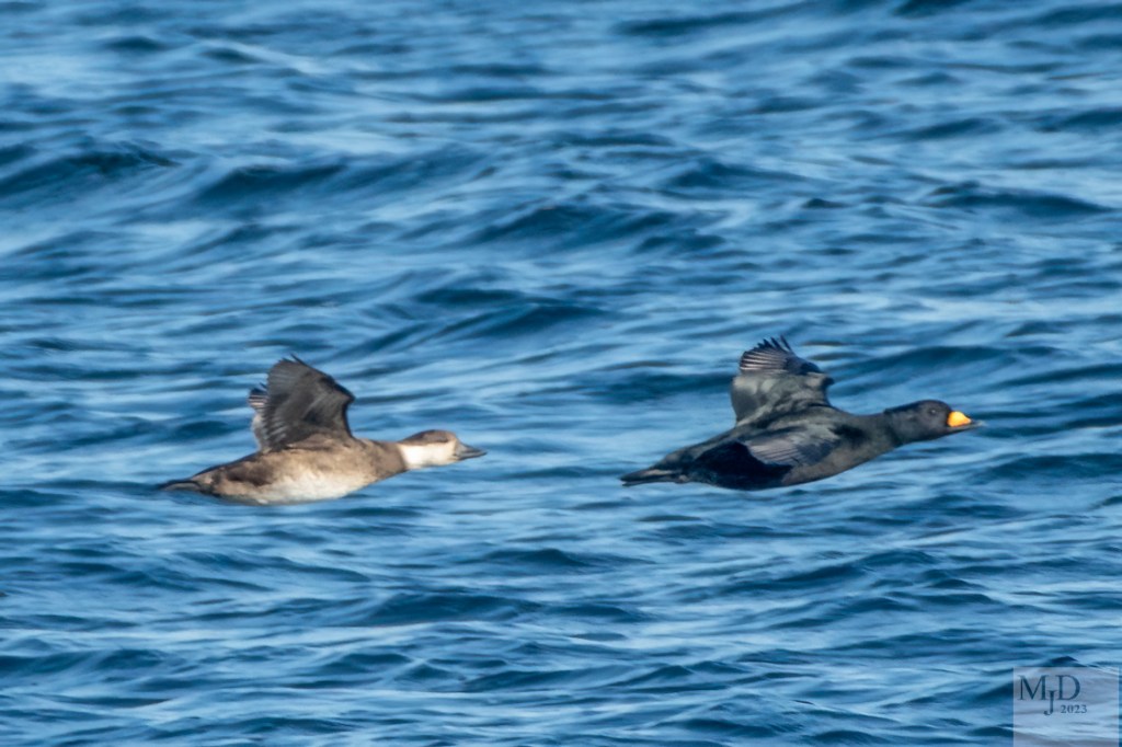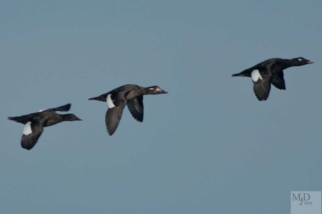 Our winter ducks are moving in. All three Scoter species flew by me while I was on the shore at Cape Ann, Massachusetts. These diving sea ducks breed in the far north of Europe, Asia and North America, then move further south for the winter. The species, from top to bottom, are Surf Scoter, White-winged Scoter and Black Scoter.