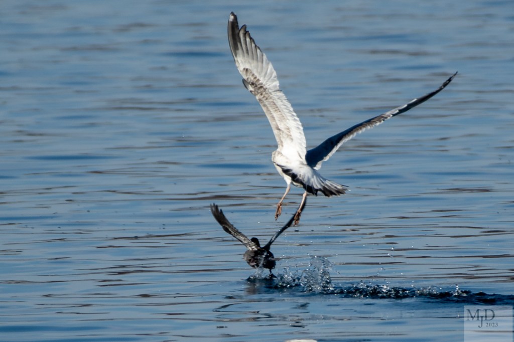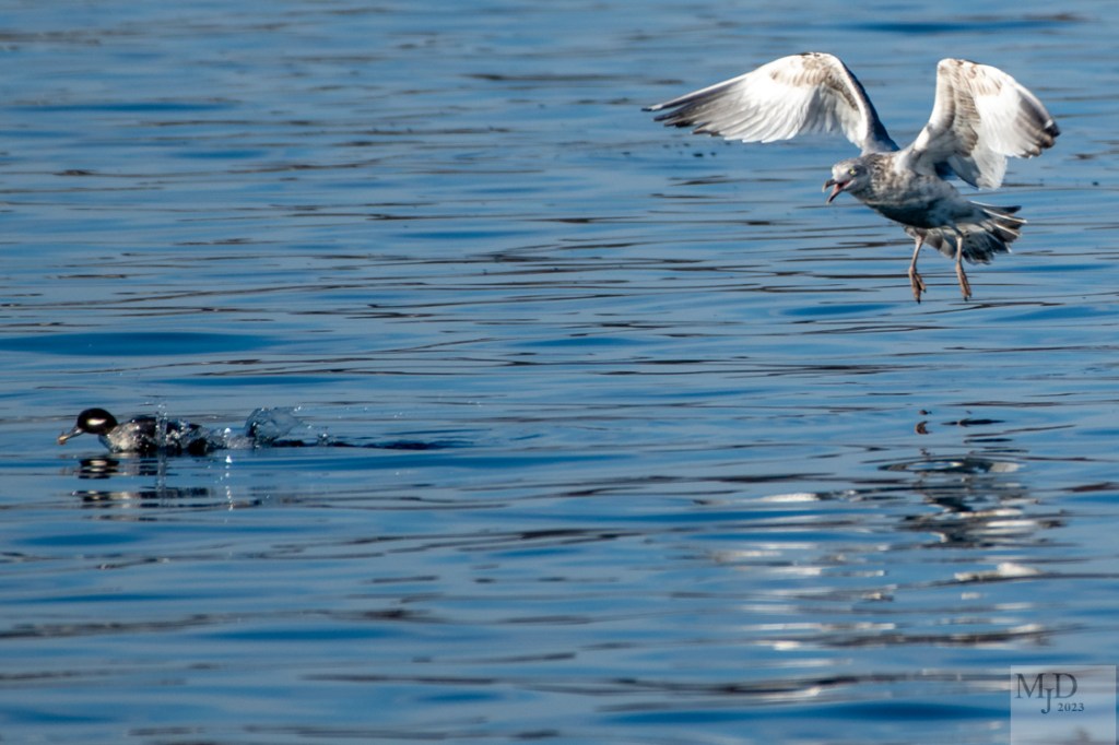 Suddenly, a large pirate (gull) swoops in to try to steal the little duck’s catch.