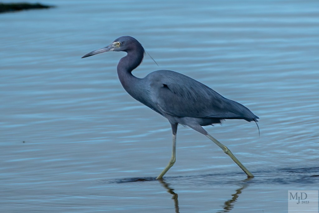 The next is the Little Blue Heron. It’s a bit smaller but the size difference isn’t obvious unless the two birds are standing near each other. It’s body has a more bluish tint than the Egret. The neck on the Little Blue is purple shaded, not rusty. It doesn’t look shaggy on this individual but it often can be somewhat shaggy in appearance. The legs are are much lighter than those of the Egret. The beak is not as robust and is grey, not pinkish.