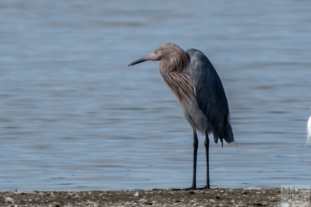 These two wading birds are quite similar and often seen in the same environment. Depending on lighting and distance, they can be confused with only a quick glance. The first photo is of a Reddish Egret. It has a shaggy, rust colored neck. The robust bill is pinkish with a dark tip. The legs are very dark and the body is a slate-gray.