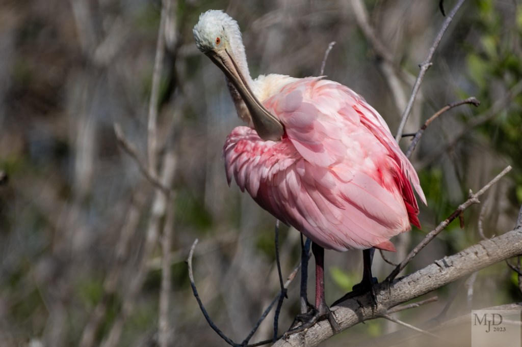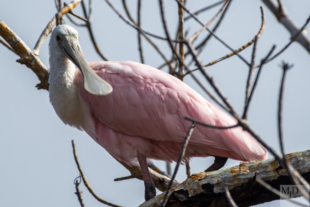 Roseate Spoonbills bald as they age, losing the feathers on their heads. Those of us with male pattern baldness are sympathetic!