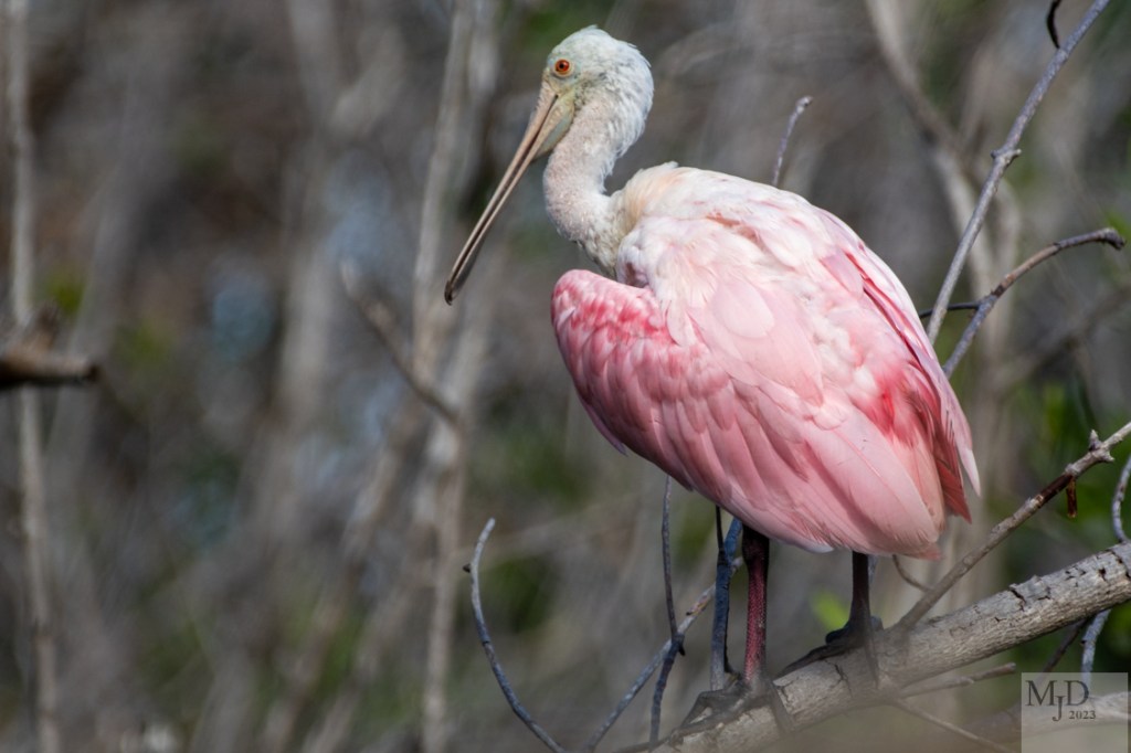 It’s a large, goose-sized bird that can be up to 34 inches (86 cm) long. It sweeps that big bill around to grab crustaceans and fish. The pink color comes from the carotenoids in the shellfish in its diet.